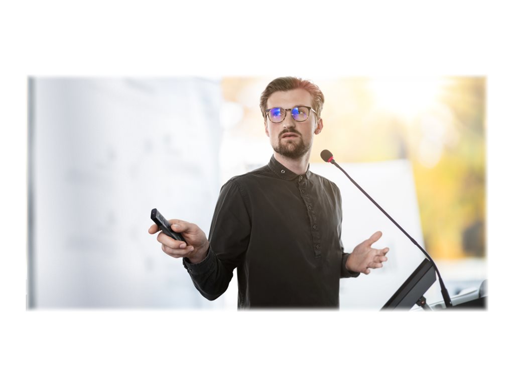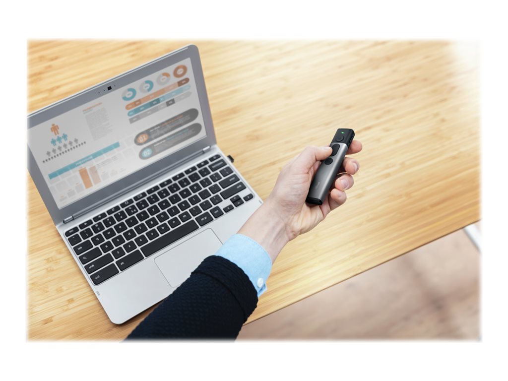 Lorsque vous êtes prêt à commencer votre présentation, branchez simplement le microrécepteur USB sur votre PC ou ordinateur portable (également compatible Mac) et vous pouvez démarrer immédiatement. Le récepteur sans fil a une portée étendue allant jusqu'à 30 mètres, ce qui vous permet de vous déplacer librement tout en parlant à votre public. La batterie se recharge facilement à l'aide du câble Micro-USB fourni.