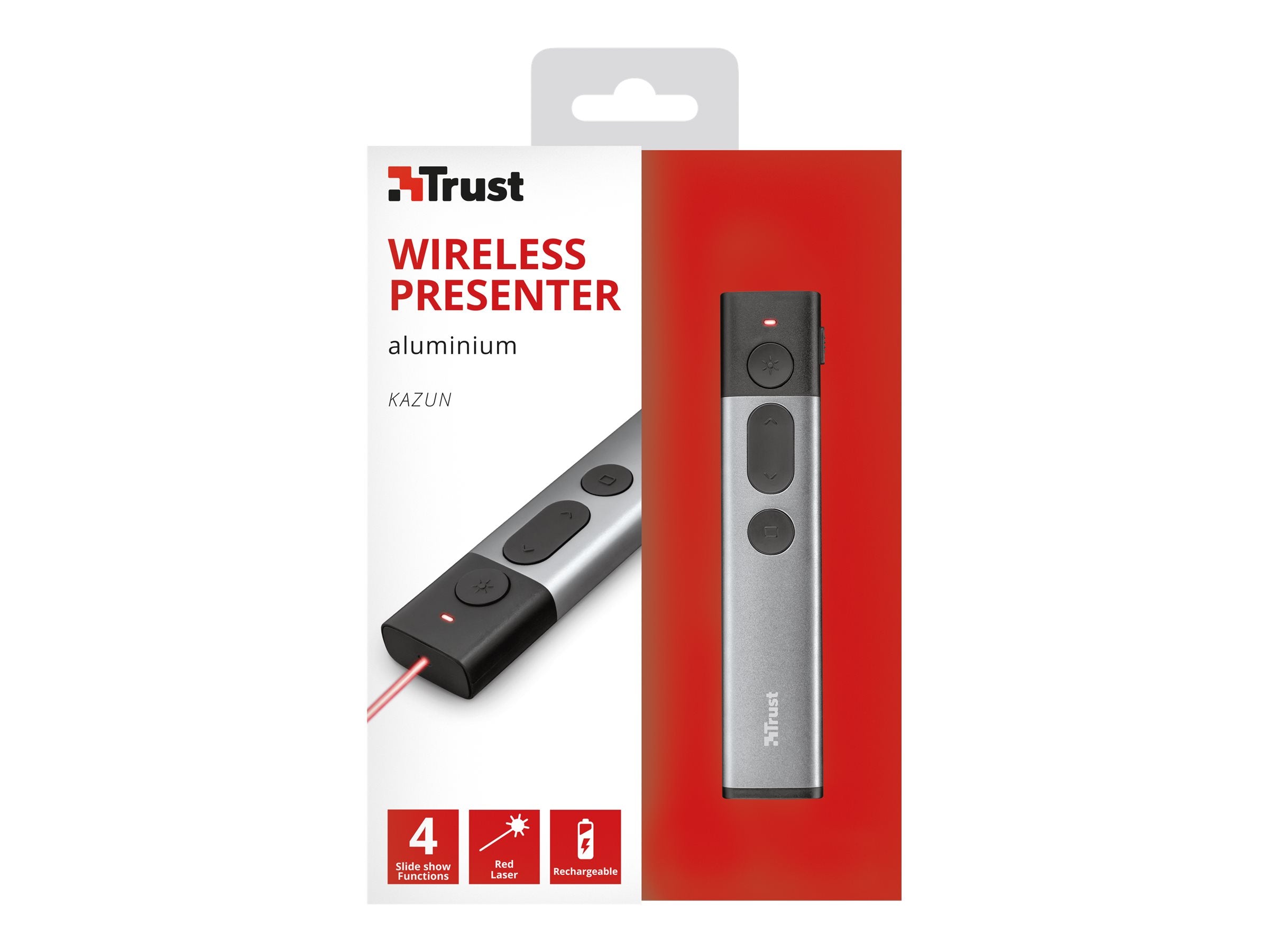 Trust Kazun Aluminium Wireless Presenter - Télécommande de présentation - 4 boutons - RFLes présentations sont désormais un jeu d'enfant avec le pointeur laser sans fil Kazun en aluminium. En ayant le contrôle total de votre présentation, vous pourrez vous concentrer sur votre histoire et votre public.
