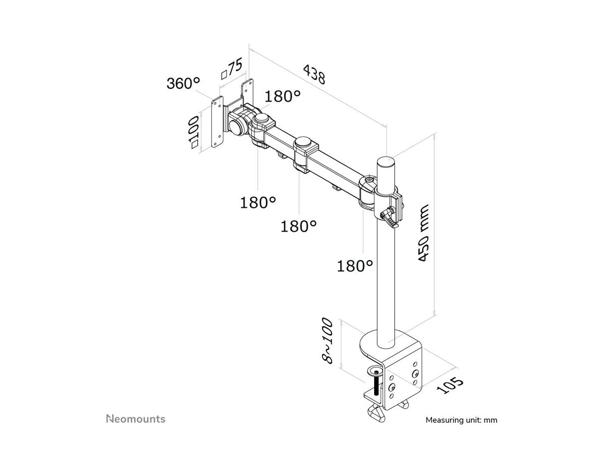 Neomounts FPMA-D960 - Kit de montage - pleine action - pour Écran LCD - noir - Taille d'écran : 10"-30" - pinces montables, montrable sur bureauLe support de bureau Neomounts, modèle FPMA-D960 est un support de bureau ave inclinaison, rotation et pivot pour écrans plats jusqu'à 30". Ce support est une excellente solution pour économiser de l'espace sur les bureaux en l'installant à l'aide d'une pince de bureau ou œillet à monter.