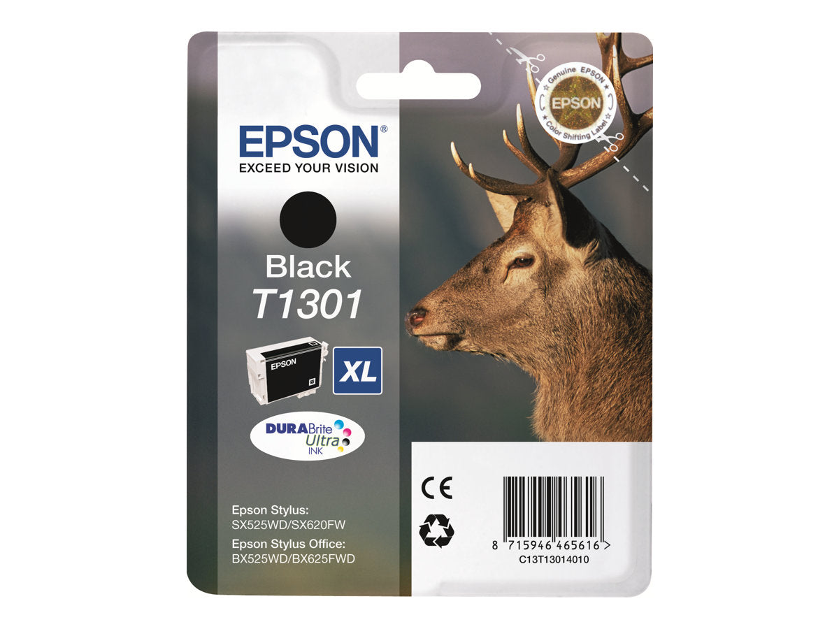 Epson T1301 - 25.4 ml - taille XL - noir - original - emballage coque avec alarme radioélectrique/ acoustique - cartouche d'encre - pour Stylus Office BX535, BX630, BX635, BX935, WorkForce WF-3520, 3530, 3540, 7015, 7515, 7525Réduisez vos coûts d'impression avec les cartouches d'encre très haute capacité