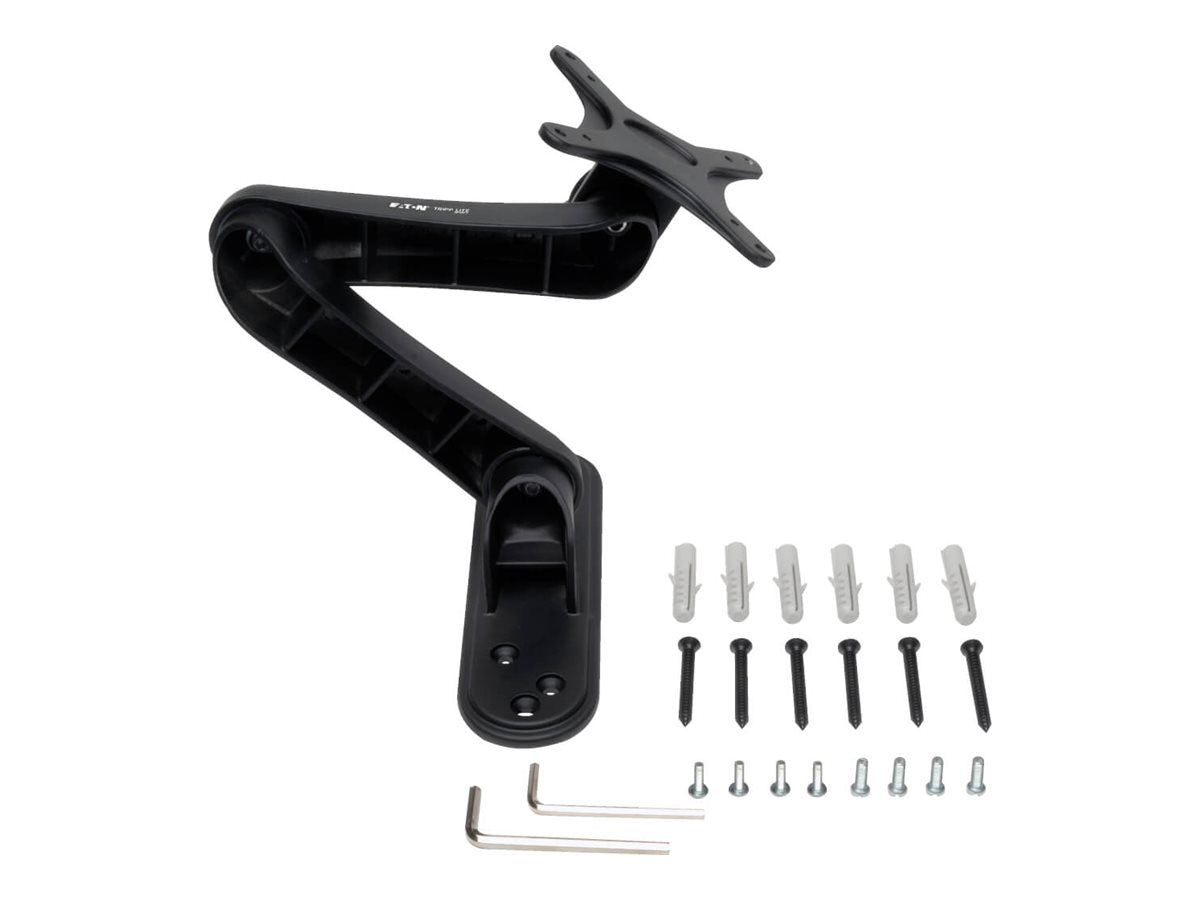 Eaton Tripp Lite Series Display TV LCD Wall Monitor Mount Fixed Arm Swivel/Tilt 13" to 27" TVs / EA / Flat-Screens - Support - pour Écran LCD - acier - noir - Taille d'écran : 13"-27" - montable sur murLe support mural pivotant/inclinable DWM1327SE compatible VESA vous permet de monter votre télévision, moniteur ou autre affichage à écran plat au mur. Idéal pour le domicile, le bureau, les hôtels, les bars et les restaurants, il s'adapte à la plupart des affichages à écran plat de 13 à 27 pouces.Le bras pivotant à mouvement complet peut être réglé en angle pour vous procurer une flexibilité maximale lors du positionnement de votre écran afin de l'adapter à votre environnement et à votre niveau de confort. La possibilité de pivotement à 180° et d'inclinaison de -15° à +15° réduit les reflets et permet une visualisation confortable depuis de nombreux angles.Le cadre durable entièrement en métal avec finition à revêtement en poudre résistante aux rayures supporte jusqu'à 33 livres (15 kg). Livré entièrement assemblé pour un montage rapide au mur avec le matériel fourni. Conforme aux écrans compatibles VESA avec l'une des configurations de trous de montage suivantes : 75 x 75 mm et 100 x 100 mm.