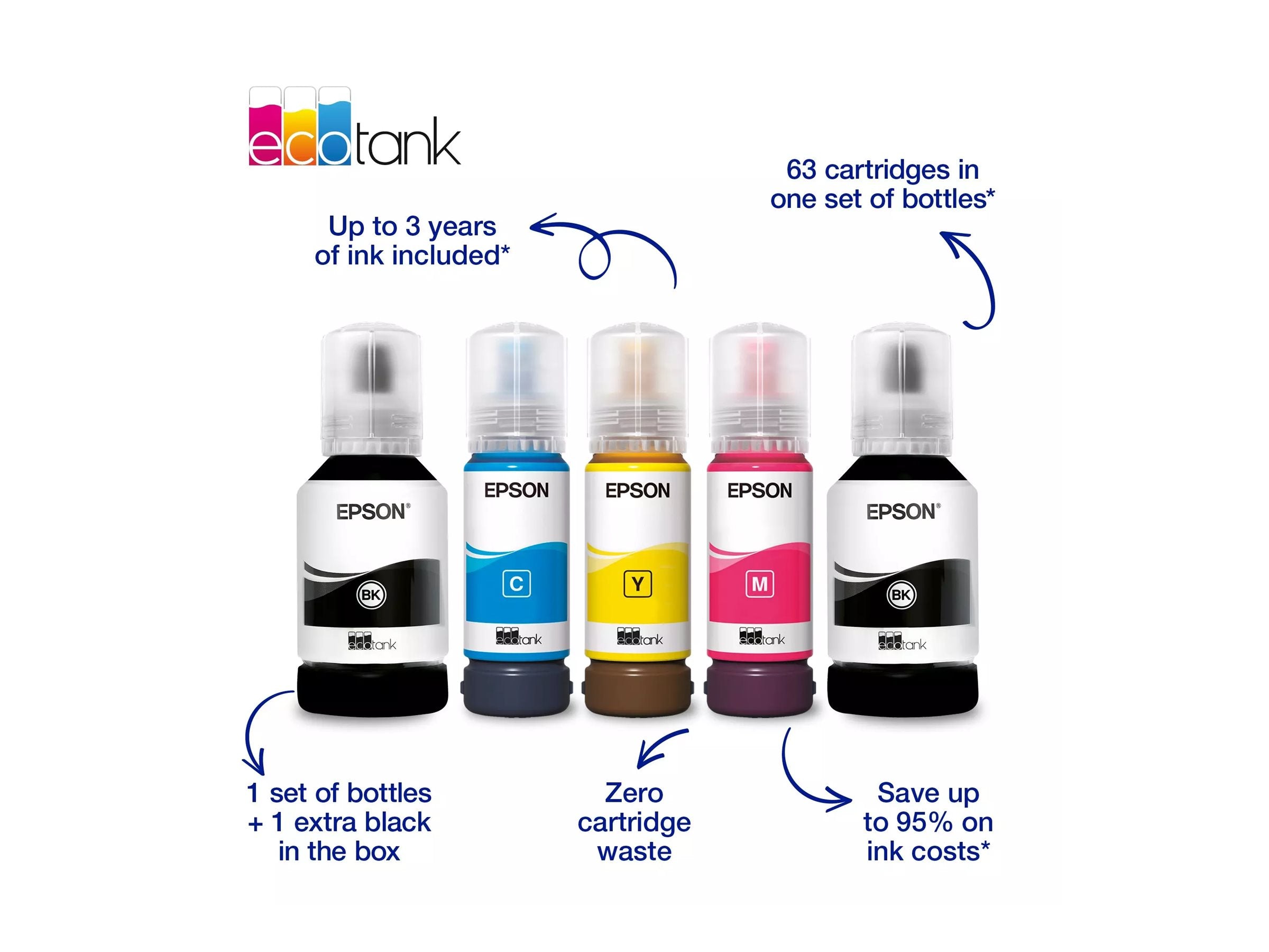 Économisez jusqu'à 95 % sur les coûts de l'encre avec les imprimantes EcoTank sans cartouches d'Epson. Fournie avec des bouteilles d'encre haute capacité, ses réservoirs d'encre intégrés sont faciles à remplir grâce aux bouteilles d'encre spécialement conçues. Sans aucune cartouche à remplacer et dotée de différentes fonctionnalités de connectivité, cette imprimante multifonction est idéale pour les personnes qui recherchent des impressions de haute qualité et un coût par page très bas.