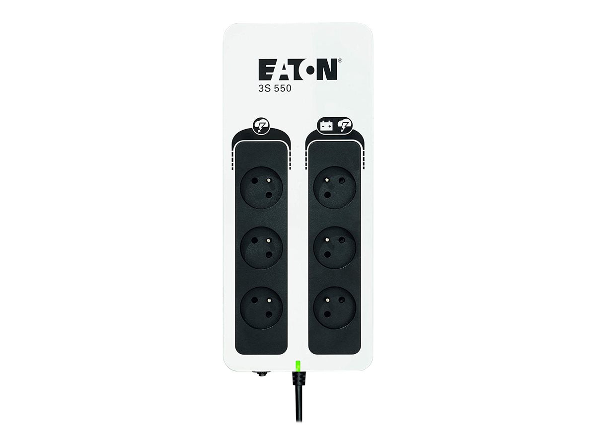 Eaton 3S 550 - Onduleur - CA 220-240 V - 330 Watt - 550 VA - monophasé - USB - connecteurs de sortie : 6Eaton 3S fournit une protection contre l'alimentation et les surtensions pour les ordinateurs de bureau, les réseaux sans fil, les consoles de jeux et autres appareils électroniques essentiels à la maison ou au travail. Son design attrayant et sa finition brillante font de l'Eaton 3S un produit parfaitement adapté à l'environnement de bureau moderne. L'unité compacte s'installe sur ou sous votre bureau ou peut être fixée au mur. La batterie facile à remplacer contribue à prolonger la durée de vie de l'onduleur. Port USB compatible HID (câble fourni), pour une intégration automatique avec les principaux systèmes d'exploitation (Windows/Mac OS/Linux).