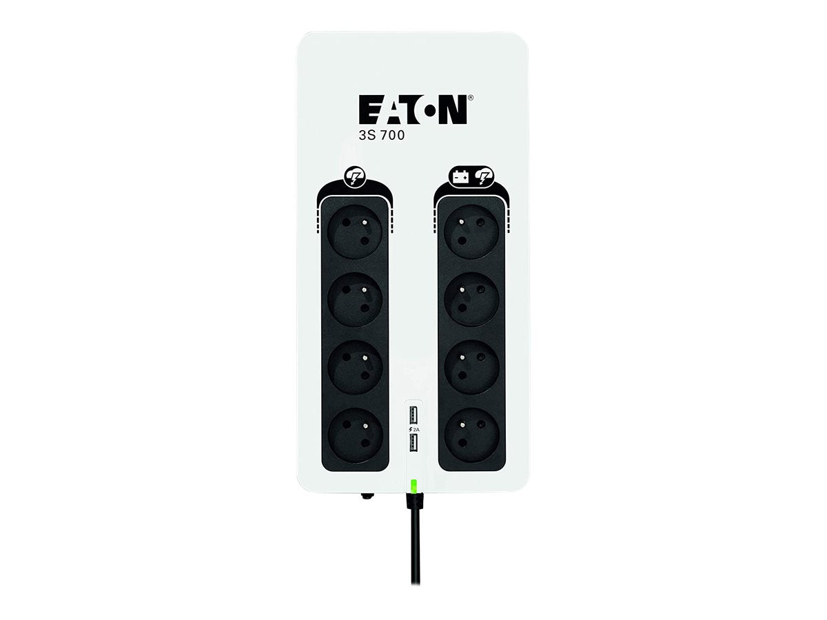 Eaton 3S 700 - Onduleur - CA 220-240 V - 420 Watt - 700 VA - monophasé - USB - connecteurs de sortie : 8Eaton 3S fournit une protection contre l'alimentation et les surtensions pour les ordinateurs de bureau, les réseaux sans fil, les consoles de jeux et autres appareils électroniques essentiels à la maison ou au travail. Son design attrayant et sa finition brillante font de l'Eaton 3S un produit parfaitement adapté à l'environnement de bureau moderne. L'unité compacte s'installe sur ou sous votre bureau ou peut être fixée au mur. La batterie facile à remplacer contribue à prolonger la durée de vie de l'onduleur. Port USB compatible HID (câble fourni), pour une intégration automatique avec les principaux systèmes d'exploitation (Windows/Mac OS/Linux).