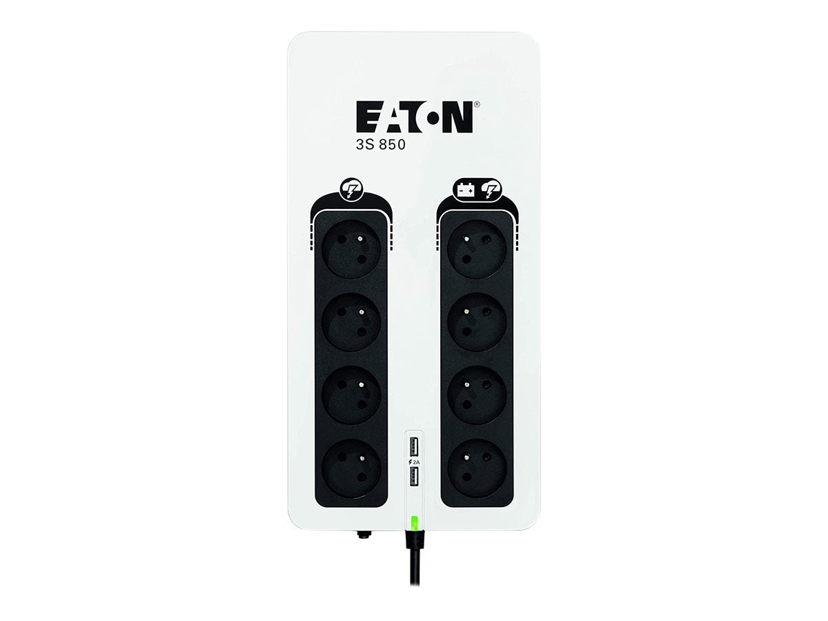 Eaton 3S 850 - Onduleur - CA 220-240 V - 510 Watt - 850 VA - monophasé - USB - connecteurs de sortie : 8Eaton 3S fournit une protection contre l'alimentation et les surtensions pour les ordinateurs de bureau, les réseaux sans fil, les consoles de jeux et autres appareils électroniques essentiels à la maison ou au travail. Son design attrayant et sa finition brillante font de l'Eaton 3S un produit parfaitement adapté à l'environnement de bureau moderne. L'unité compacte s'installe sur ou sous votre bureau ou peut être fixée au mur. La batterie facile à remplacer contribue à prolonger la durée de vie de l'onduleur. Port USB compatible HID (câble fourni), pour une intégration automatique avec les principaux systèmes d'exploitation (Windows/Mac OS/Linux).