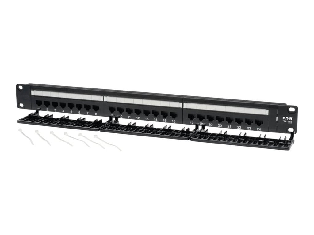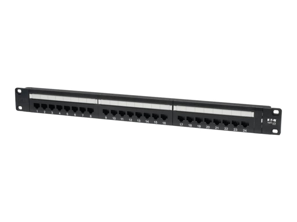 Eaton Tripp Lite Series 24-Port Cat6 Cat5 Patch Panel Rackmount 110 Punch Down RJ45 Ethernet 1URM - Tableau de connexions - CAT 6 - 1U - 19" - 24 portsLes panneaux de brassage de catégorie 6 Tripp Lite vous procurent fonctionnalités et compatibilité comme toute autre marque. Chaque panneau dispose d'une terminaison de type 110, tout en respectant et en dépassant les spécifications matérielles de connexion EIA/TIA TSB-40 Cat6. Codage couleur pour les installations EIA/TIA 568A et 568B. Les 24 ports permettent de nombreuses possibilités Plug and Play. La numérotation claire sur l'avant et l'arrière de chaque panneau procure une façon rapide et facile d'identifier les passages de câbles et la conception du panneau de 19 pouces (0,48m) à haute densité vous permet de gagner une place précieuse dans le rack.
