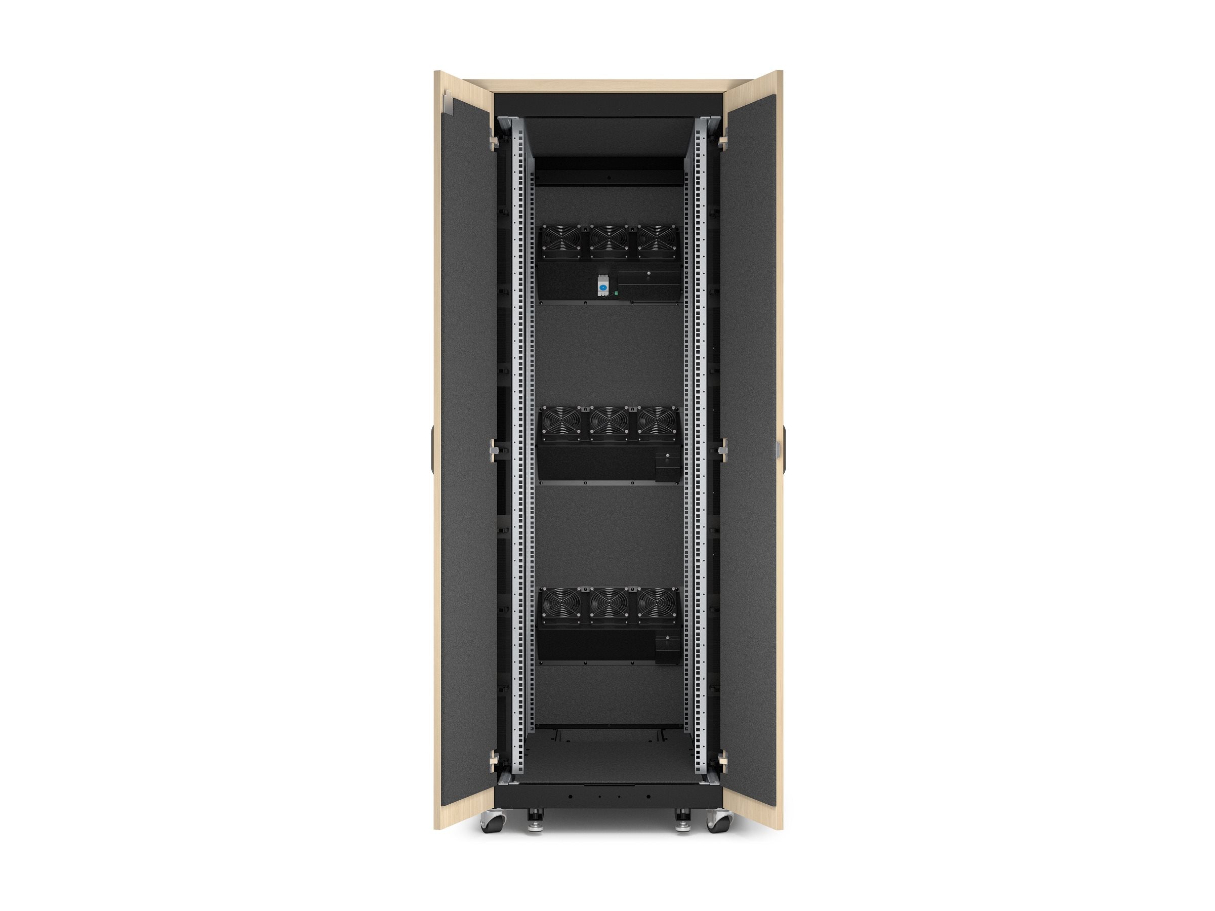 AR4038LIA finition érable est entièrement prémonté, il se compose d'une armoire, de modules de ventilation, de pieds réglables, de roulettes, d'un bandeau de 4 prises C13 et d'une connexion d'entrée C14.