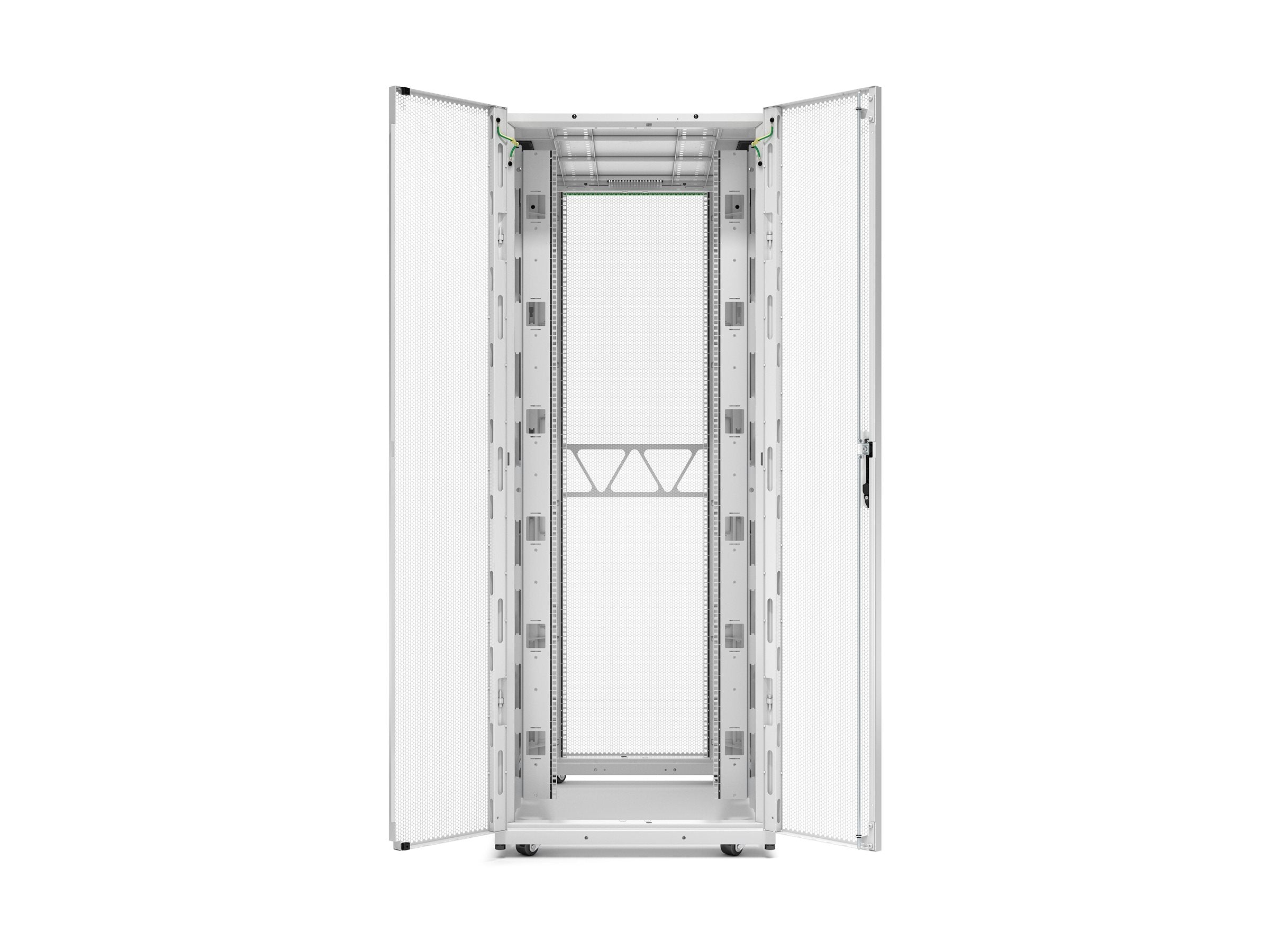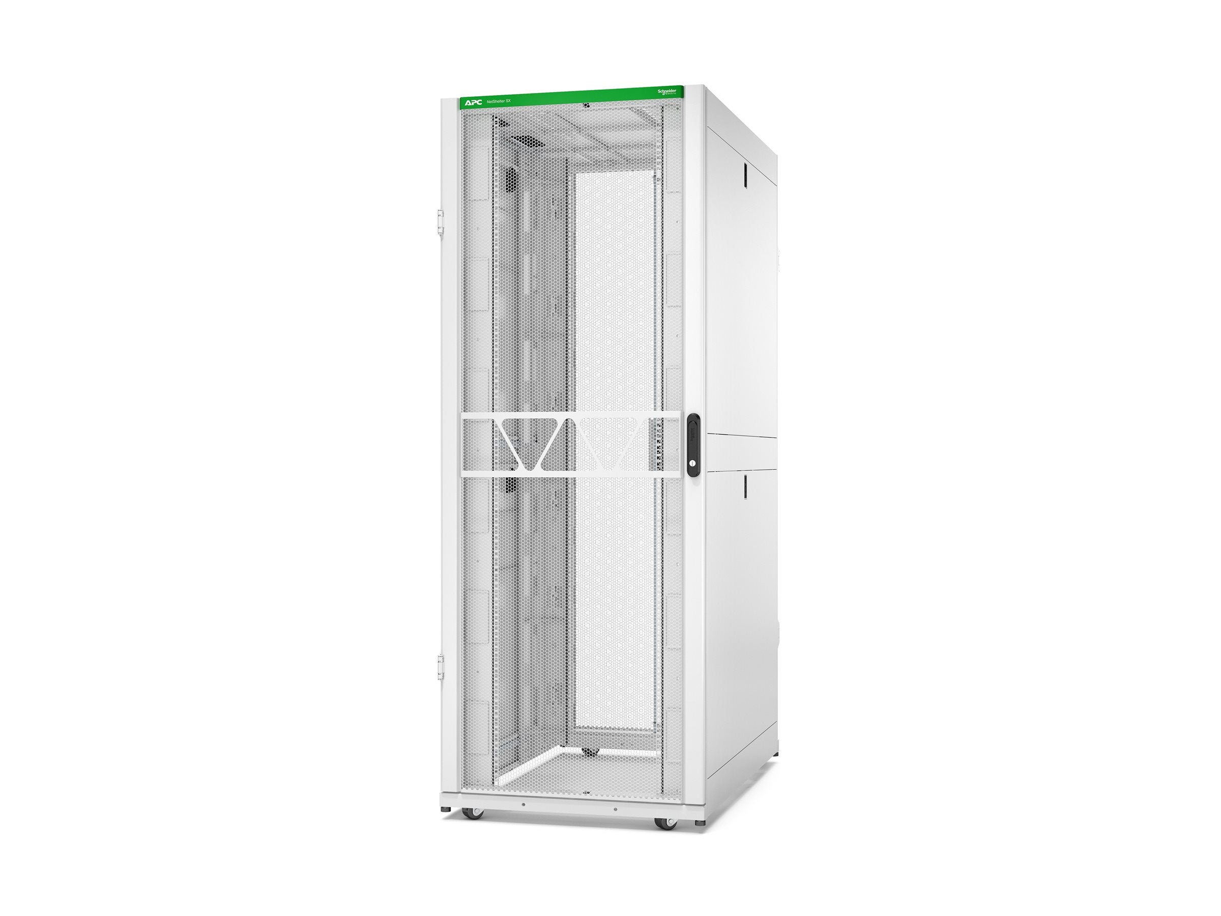 APC NetShelter SX Gen 2 - Rack armoire - H 1991 x L 750 x P 1200 mm, avec les côtés - sur le sol - blanc - 42U - 19" - Conformité TAALe rack APC Netshelter SX Enclosures est fiable, polyvalente et conçu pour les environnements informatiques exigeants. Avec des capacités de charge plus importantes et plus d'espace pour les équipements, il permet une plus grande densité informatique. Il est possible de choisir parmi les options standard, large, extra large et grande profondeur. L'aspect moderne est parfait pour les colocations et les entreprises en contact avec la clientèle. Le rack permet une simplification du workflow grâce à un accès facile au câblage et à l'équipement, et une optimisation de la circulation de l'air et de la gestion des câbles grâce à notre large gamme d'accessoires APC Les portes s’ouvrant à 270° (180° en baie) permettent de maintenir les allées libres, tandis que la perforation de 80 % des portes améliore la circulation de l'air pour les serveurs haute puissance. Construit de manière durable tout en acier, il dure des années et peut être utilisé pour diverses applications. Il affiche également un taux de décarbonisation de 3,3 % et est livré dans un emballage solide et recyclable.