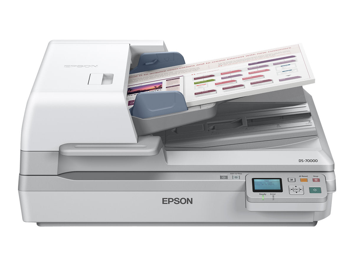 Epson WorkForce DS-70000N - Scanner de documents - Recto-verso - A3 - 600 dpi x 600 dpi - jusqu'à 70 ppm (mono) / jusqu'à 70 ppm (couleur) - Chargeur automatique de documents (200 feuilles) - jusqu'à 8000 pages par jour - Gigabit LANConçu pour s'adapter sans problème aux environnements informatiques les plus complexes, cet appareil ultra-performant peut traiter de gros volumes de documents en une seule fois, de façon rapide et efficace. Grâce à une vitesse de numérisation pouvant atteindre 70 ppm/140 ipm, ce scanner permet également d'effectuer les gros travaux de numérisation de manière fluide. Ce scanner permet une numérisation rapide et facile grâce à son chargeur automatique de documents pouvant contenir jusqu'à 200 feuilles au format A3 et grâce à ses fonctions de numérisation Recto Verso en un seul passage et de détection de doublons.