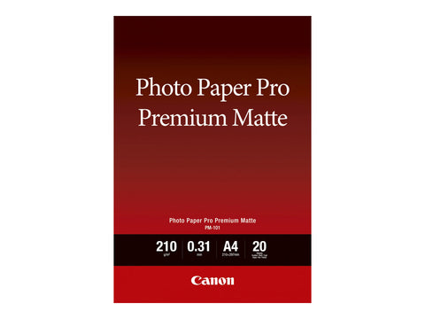 Canon Pro Premium PM-101 - Mat lisse - 310 micromètres - A4 (210 x 297 mm) - 210 g/m² - 20 feuille(s) papier photo - pour PIXMA PRO-1, PRO-10, PRO-100Texture lisse avec un rendu blanc chaud pour des impressions sans reflets brillants. Idéal pour des photos couleur et noir et blanc ainsi que pour des reproductions d'art dont les couleurs chaudes et les tons gris ont été finement travaillés.