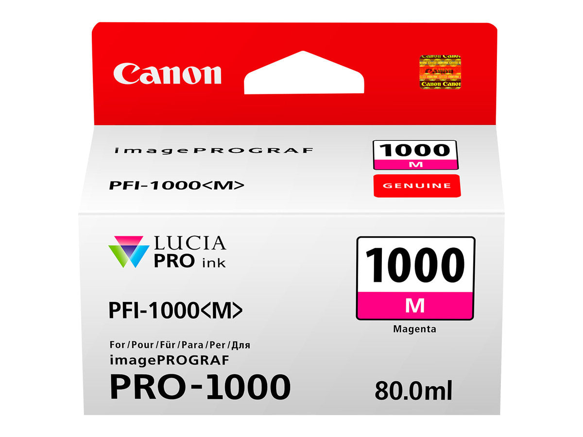 Canon PFI-1000 M - 80 ml - magenta - original - réservoir d'encre - pour imagePROGRAF PRO-1000Les encres professionnelles Canon offre une gamme de couleurs exceptionnelle et une qualité sans faille. Ce système garantit une longévité exceptionnelle des photos.