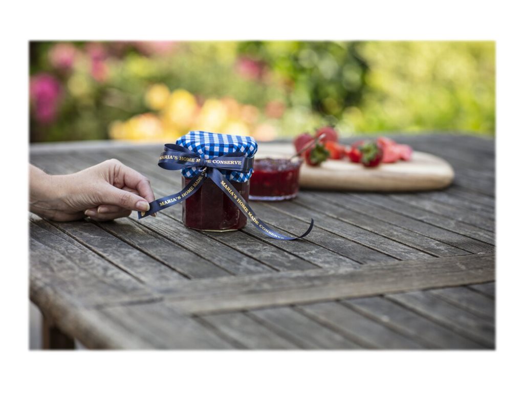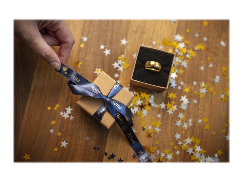 Ajoutez une touche personnelle à vos cartes et à vos cadeaux avec le ruban tissu TZe-RN34 Brother or sur bleu nuit. Ces étiquettes luxueuses sont le moyen ultime de personnaliser vos cadeaux, que ce soit lors d'occasions spéciales ou tout simplement pour ajouter une touche originale.
