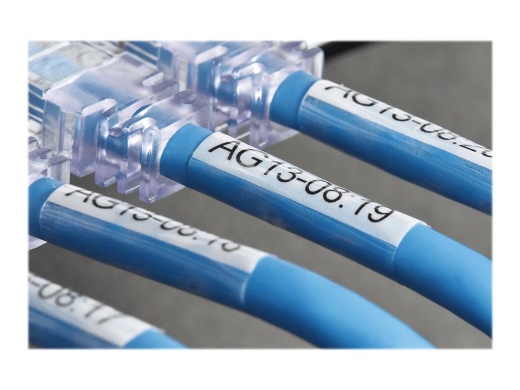 Comme le texte de l'étiquette est protégé par une couche laminée qui est appliquée automatiquement lors de l'impression, cette étiquette de 24 mm de largeur peut être enroulée autour des câbles CAT6A de plus grand diamètre tout en assurant la protection de votre texte contre l'abrasion et d'autres conditions extrêmes.