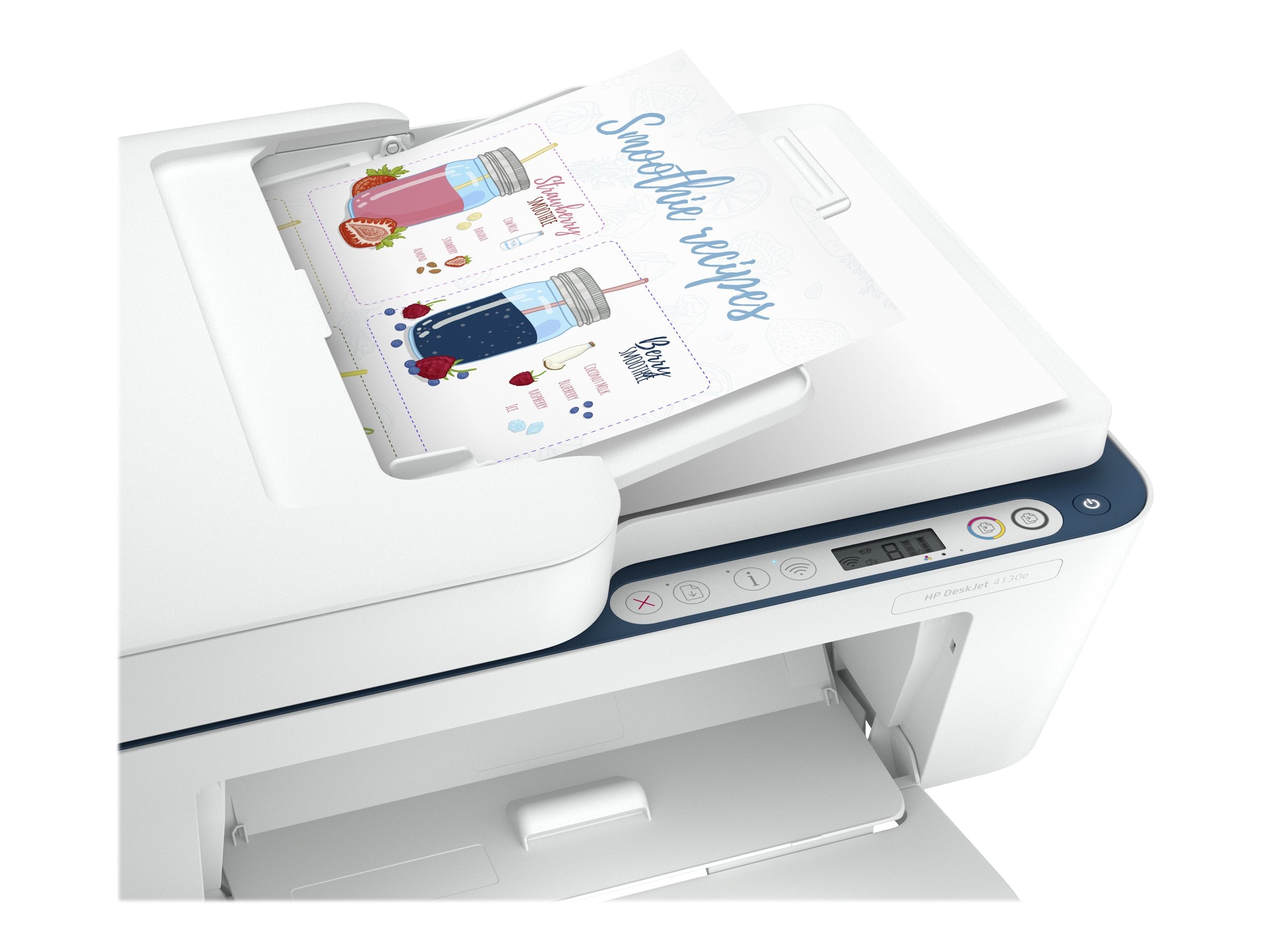 HP Deskjet 4130e All-in-One - Imprimante multifonctions - couleur - jet d'encre - 216 x 297 mm (original) - A4/Legal (support) - jusqu'à 6 ppm (copie) - jusqu'à 8.5 ppm (impression) - 60 feuilles - 14.4 Kbits/s - USB 2.0, Wi-Fi(n), Bluetooth - indigo - Compatibilité HP Instant InkToutes les fonctionnalités. Toute la valeur. Imprimez, numérisez, copiez et recevez un chargeur automatique de 35 pages. Configuration simple et sans fil sans tracas. Choisissez HP+ et recevez 6 mois d'Instant Ink et 1 an supplémentaire de garantie HP avec utilisation exclusive de l'encre HP authentique.