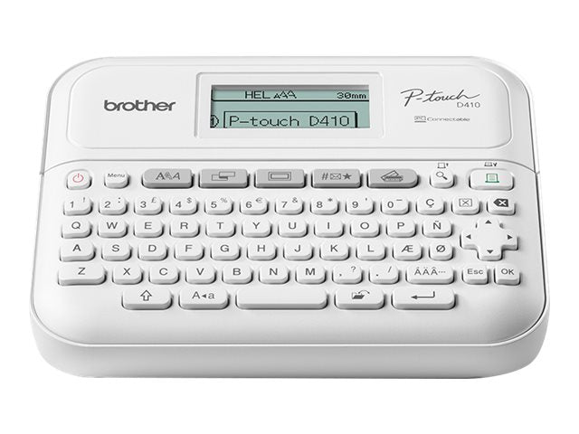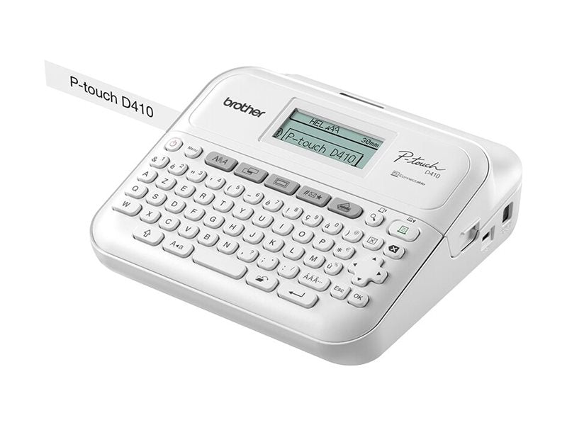 Brother P-Touch PT-D410 - Étiqueteuse - Noir et blanc - transfert thermique - 18 mm de large - 180 dpi - jusqu'à 20 mm/sec - USB - outil de coupe - impression miroir, impression verticale, impression par 5 lignes, aperçu avant impression, impression multicopieTrouver rapidement des éléments importants tels que le contenu des dossiers, des documents archivés, des disques de sauvegarde de données/clés USB et des étagères est la clé d'un bureau organisé. Doté d'un clavier large et facile à saisir, d'un affichage graphique avec aperçu avant impression et de fonctions spéciales permettant de créer rapidement des étiquettes pour les tâches d'étiquetage courantes, le P-touch D400VP est la machine d'étiquetage idéale pour les bureaux très occupés.