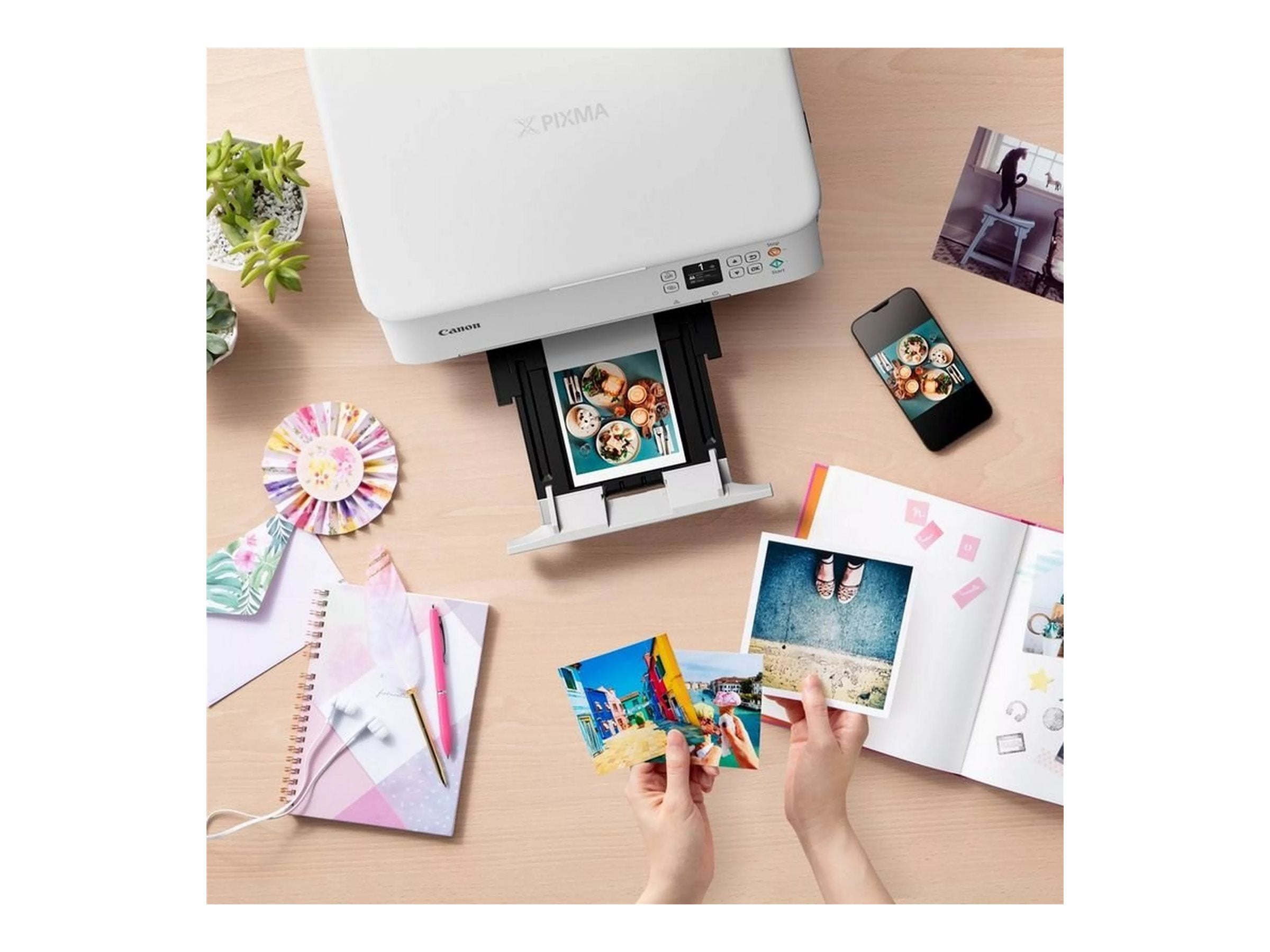 Canon PIXMA TS5351i - Imprimante multifonctions - couleur - jet d'encre - A4 (210 x 297 mm), Legal (216 x 356 mm) (original) - A4/Legal (support) - jusqu'à 13 ipm (impression) - 200 feuilles - USB 2.0, Wi-Fi(n) - blancCet appareil 3-en-1 au design contemporain bicolore est doté d'une barre d'état à DEL, idéal pour les créatifs modernes. Soyez à la hauteur de vos ambitions et réalisez vos créations avec Easy-PhotoPrint Editor, ou essayez les créations en papier de Creative Park. Chargez par l'arrière des supports créatifs, comme des supports autocollants et du papier mat recto verso, pour concrétiser vos idées. Prenez le contrôle avec votre smartphone grâce à la connectivité sans fil rapide et imprimez, numérisez et connectez-vous à vos réseaux sociaux via l'application Canon PRINT d'une simple pression sur un bouton. Pour des images dignes d'être partagées, profitez des cartouches FINE et du système d'encre ChromaLife100 pour des photos haute qualité et longue durée.