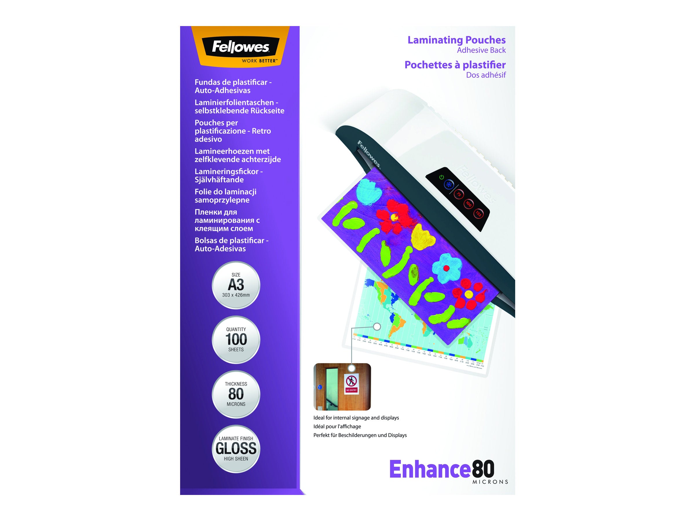 Fellowes - 80 microns - A3 (297 x 420 mm) 100 unités pochettes plastifiéesLes pochettes à dos adhésif sont faciles à fixer sur les murs ou autres supports.