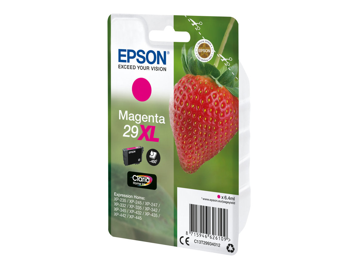 Epson 29XL - 6.4 ml - XL - magenta - original - emballage coque avec alarme radioélectrique/ acoustique - cartouche d'encre - pour Expression Home XP-235, 245, 247, 255, 332, 335, 342, 345, 432, 435, 442, 445, 455L'encre Epson Claria Home Ink se présente sous la forme d'un kit de cartouches d'encre 4 couleurs polyvalent qui permet d'imprimer des textes nets et précis, ainsi que des photos brillantes et de qualité professionnelle. Elle est idéale pour imprimer à un coût raisonnable et en toute fiabilité, sans compromis sur la qualité.