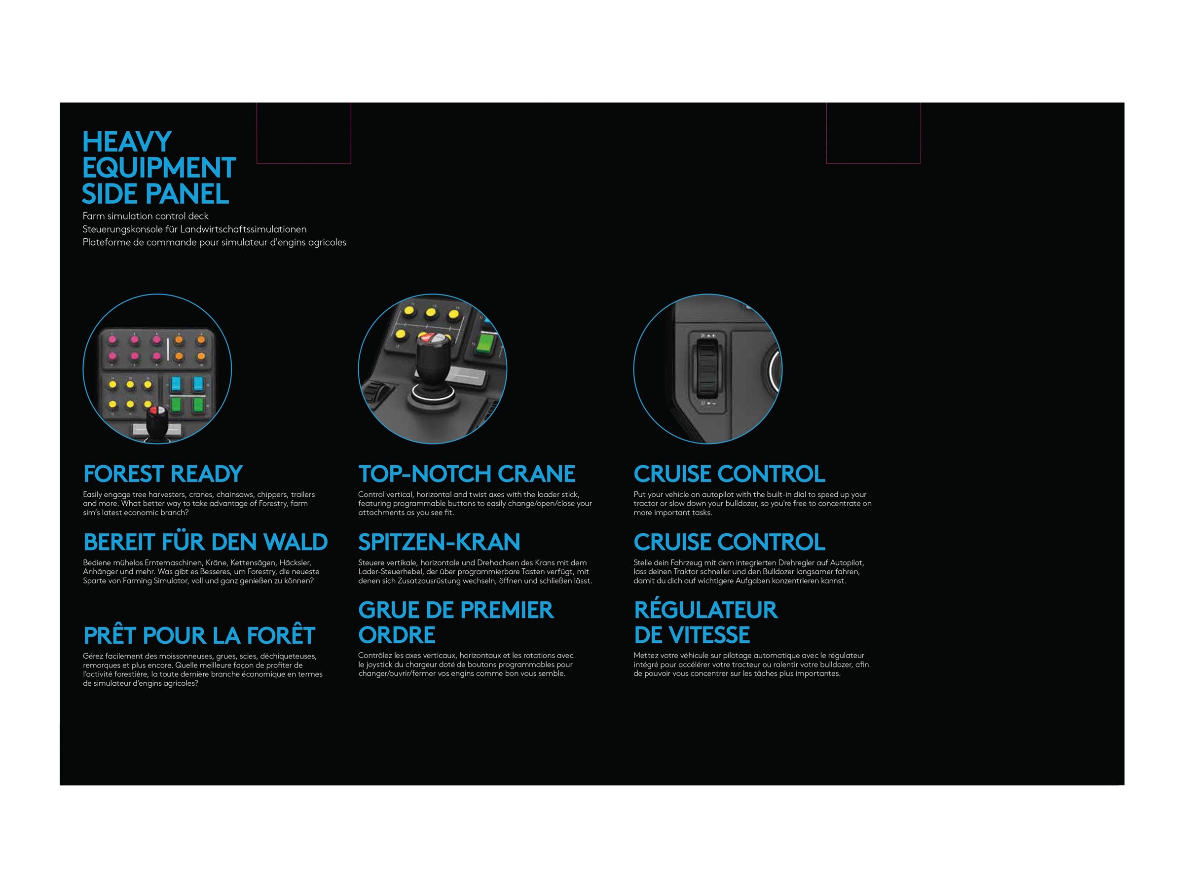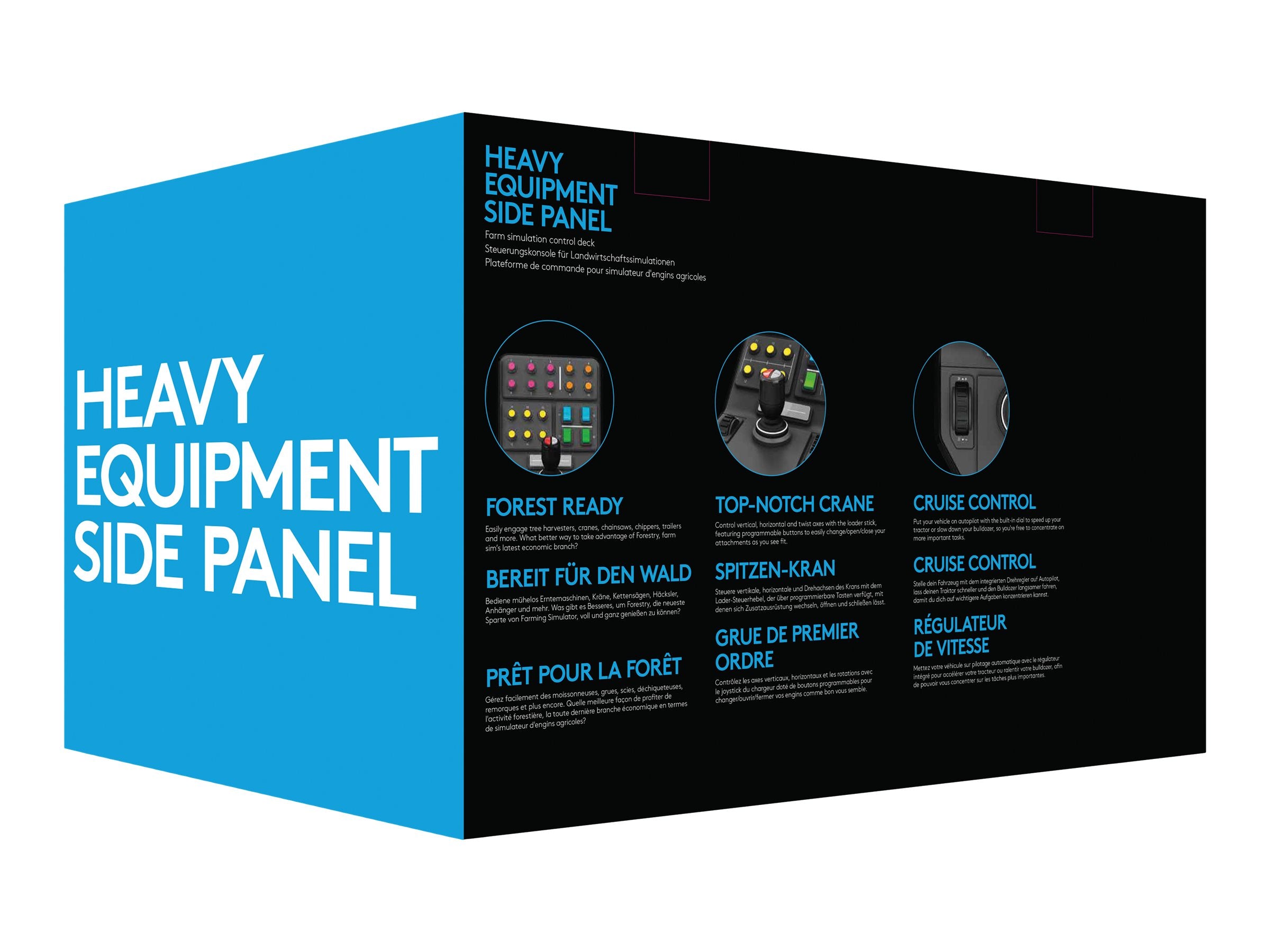 Logitech Heavy Equipment Side Panel - Contrôleur de simulateur de vol - filaire - pour PCStick du chargeur avant réaliste.Obtenez la sensation du véritable contrôle sur des véhicules lourds comme les moissonneuses, grues, scies, déchiqueteuses, remorques et plus encore. Le stick du chargeur contrôle les axes vertical, horizontal et rotatif tandis que le commutateur de mode situé en haut du stick double ces commandes en vous proposant six axes.