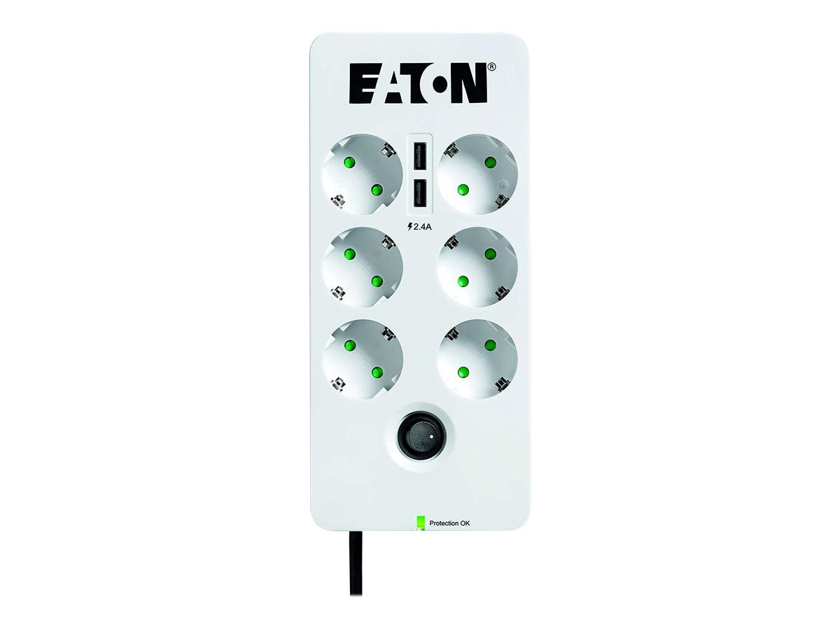 Eaton Protection Box 6 USB DIN - Protection contre les surtensions - CA 220-250 V - 2500 Watt - connecteurs de sortie : 6 - blancLa gamme Eaton Protection Box est le meilleur dispositif multi-prises premium de protection contre les surtensions et la foudre, pour les équipements sensibles et critiques en environnement résidentiel ou professionnel. Elle est conçue pour filtrer l'alimentation électrique des équipements délicats afin de les protéger contre les surtensions, les interférences et les effets indirects de la foudre. La haute performance de Protection Box est basée sur une conception avancée avec une protection contre les surtensions conforme à la norme IEC 61643-11.