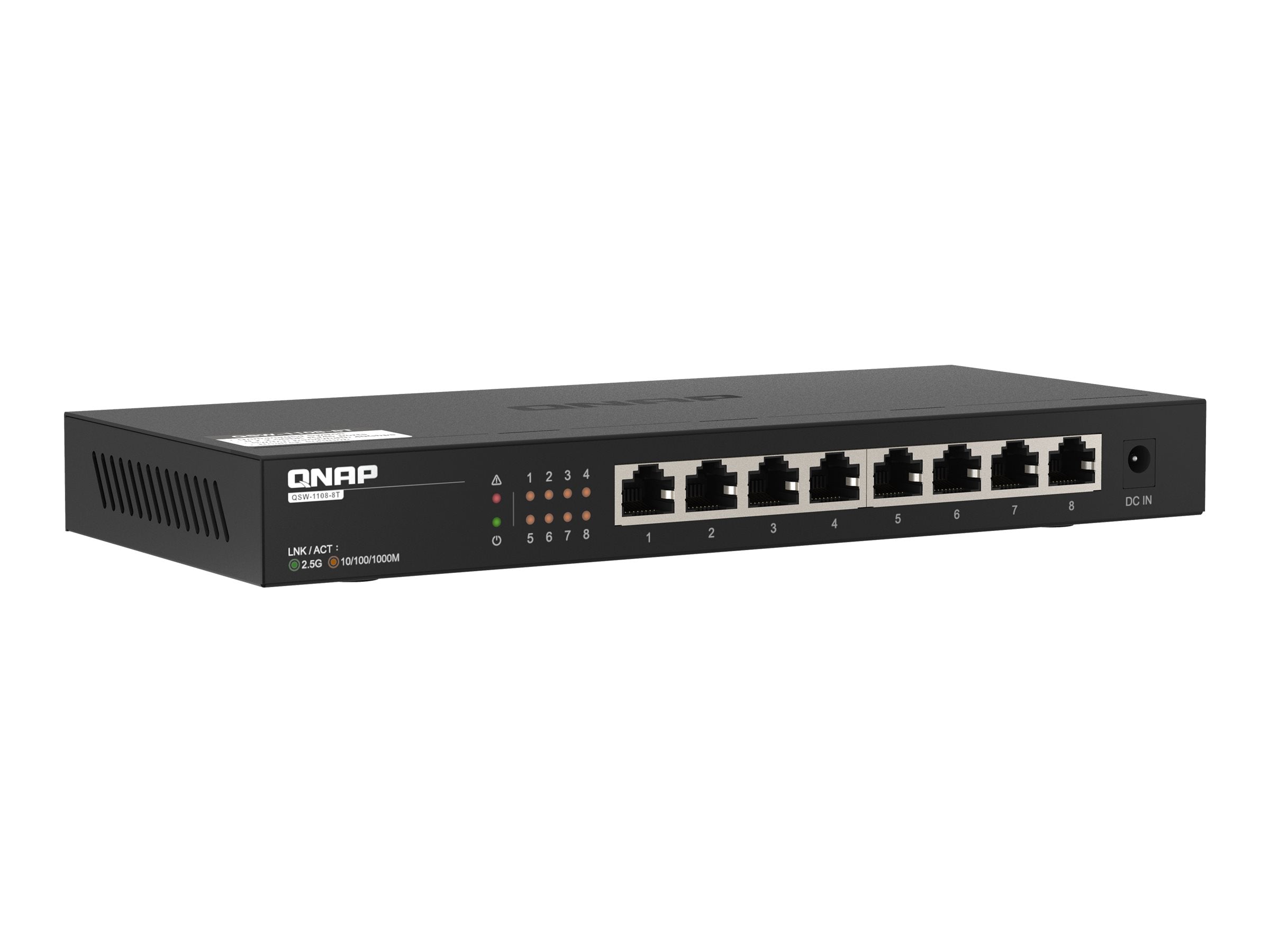 QNAP QSW-1108-8T - Commutateur - non géré - 8 x 10/100/1000/2.5G - de bureauQNAP propose des switches réseau dotés de la connectivité gigabit et 10GbE, de la prise en charge du PoE ainsi que de fonctionnalités polyvalentes pour que vous puissiez facilement et rapidement établir votre bureau idéal et environnement réseau domestique.