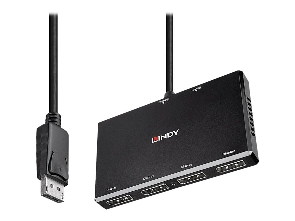 Lindy - Répartiteur vidéo/audio - 4 x DisplayPort - de bureauLe Lindy 4 Port DP MST Hub est une solution idéale pour étendre ou dupliquer les signaux DisplayPort sur 4 moniteurs DisplayPort. Les concentrateurs MST permettent de connecter un seul appareil source DP, y compris les ordinateurs, les ordinateurs portables ou les ordinateurs bloc-notes, à 4 écrans DP distincts, tout en offrant la possibilité de visualiser le contenu de plusieurs façons. Les signaux peuvent être étendus à tous les écrans pour afficher des feuilles de calcul à grande échelle, créer des expériences de jeu immersives et panoramiques ou une signalisation numérique accrocheuse dans le commerce de détail. Le contenu peut également être affiché indépendamment sur l'un ou l'autre des écrans, ce qui est idéal pour créer un environnement de travail productif et multitâche, ou dupliqué sur les écrans pour une utilisation dans les secteurs de l'hôtellerie, de la vente au détail ou de l'éducation.