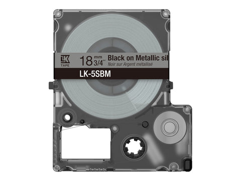 Epson LabelWorks LK-5SBM - Noir sur argent métallisé - Rouleau (1,8 cm x 9 m) 1 cassette(s) boîte de suspension - cartouche de bande - pour LabelWorks LW-C410, LW-C610Ce ruban mat avec texte est idéal pour l'impression de codes-barres, car sa surface mate est facilement lisible.