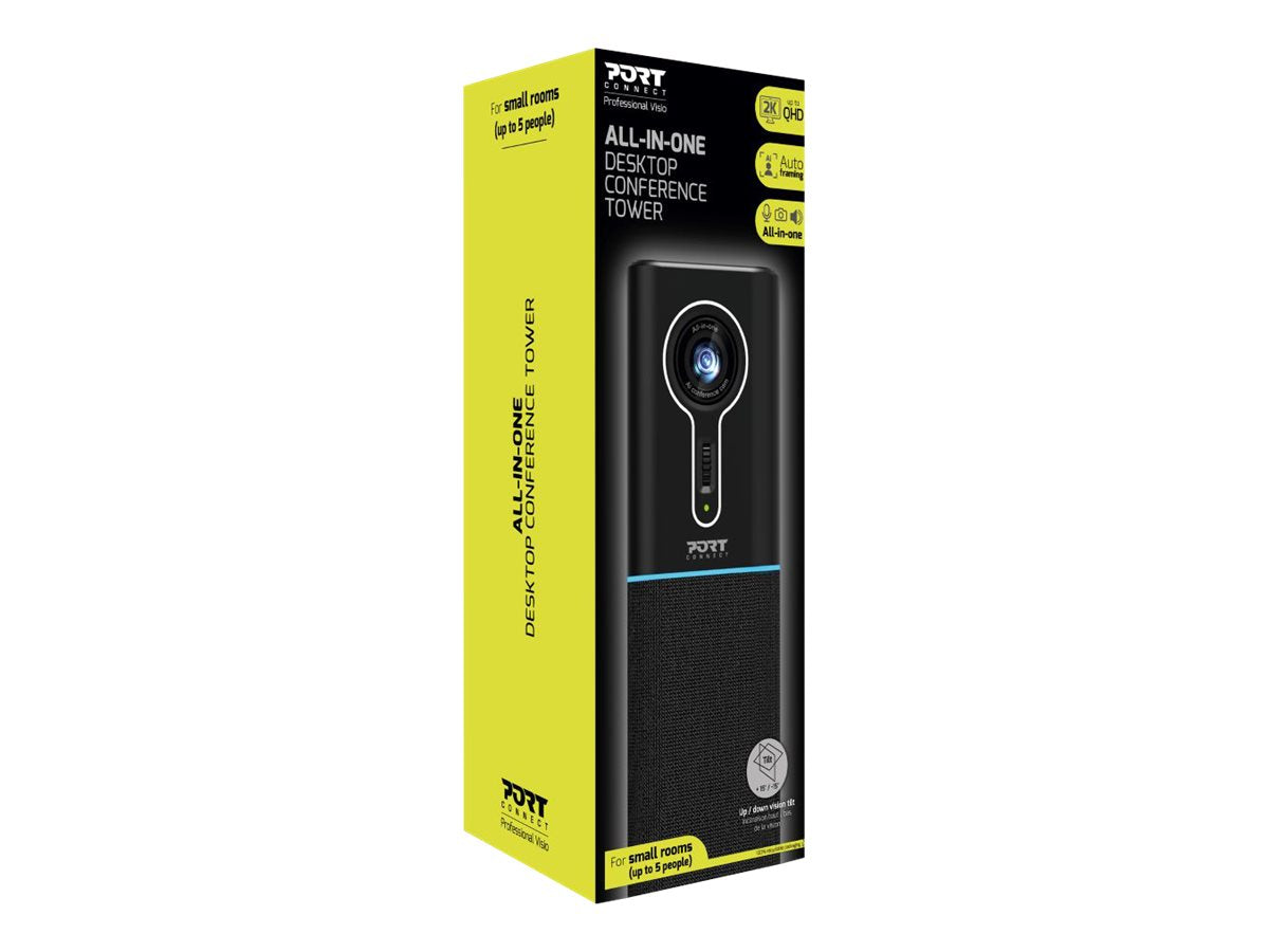 PORT Connect - All-In-One Design - caméra pour conférence - tour - couleur - 3.68 MP - 2560 x 1440 - 2K - audio - USB - 5 V CCLa tour de conférence de bureau tout-en-un PORT Connect 902004 est conçue pour les petites salles de conférence jusqu'à 5 personnes. Elle est équipée d'une caméra haute résolution jusqu'à QHD 2K pour être mieux vu. Restez concentré sur votre interlocuteur grâce à la fonction de cadrage automatique. La molette de défilement verticale vous permet de choisir l'inclinaison et d'adapter le cadrage de la salle. Gardez facilement le contrôle de vos communications grâce aux commandes tactiles et aux indicateurs LED. Ultra-mobile, vous pouvez facilement transporter votre caméra grâce à l'étui de voyage inclus. Universelle, elle se connecte par USB à votre ordinateur portable ou de bureau. Aucun pilote requis, l'installation est automatique.