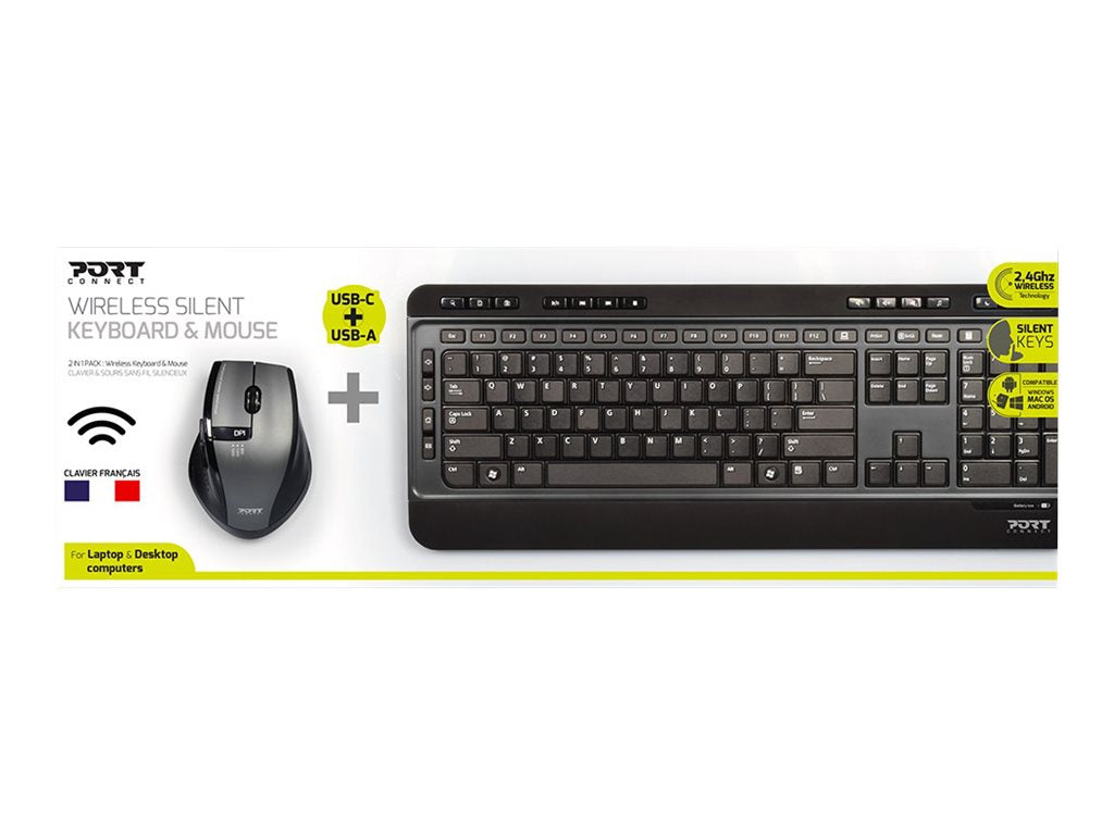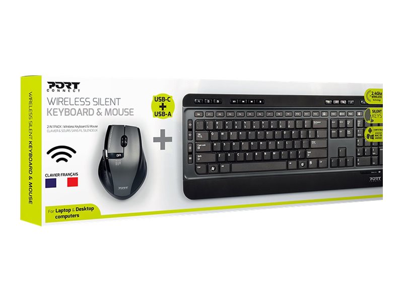PORT Connect SILENT PACK 2 IN 1 - Ensemble clavier et souris - sans fil - 2.4 GHz - USCe pack 2 en 1 contient un clavier (configuration US) et une souris sans fil et silencieux compatibles avec Windows, Mac OS et Android. Profitez d'un clavier ergonomique avec touches silencieuses et confortables et 20 touches de raccourcis multimédias. La souris silencieuse possède 5 boutons avec molette de défilement et permet une précision optimale grâce à un capteur optique intégré. Le dongle permet de connecter instantanément la souris et le clavier à votre ordinateur et est compatible avec un port USB-A ou USB-C.