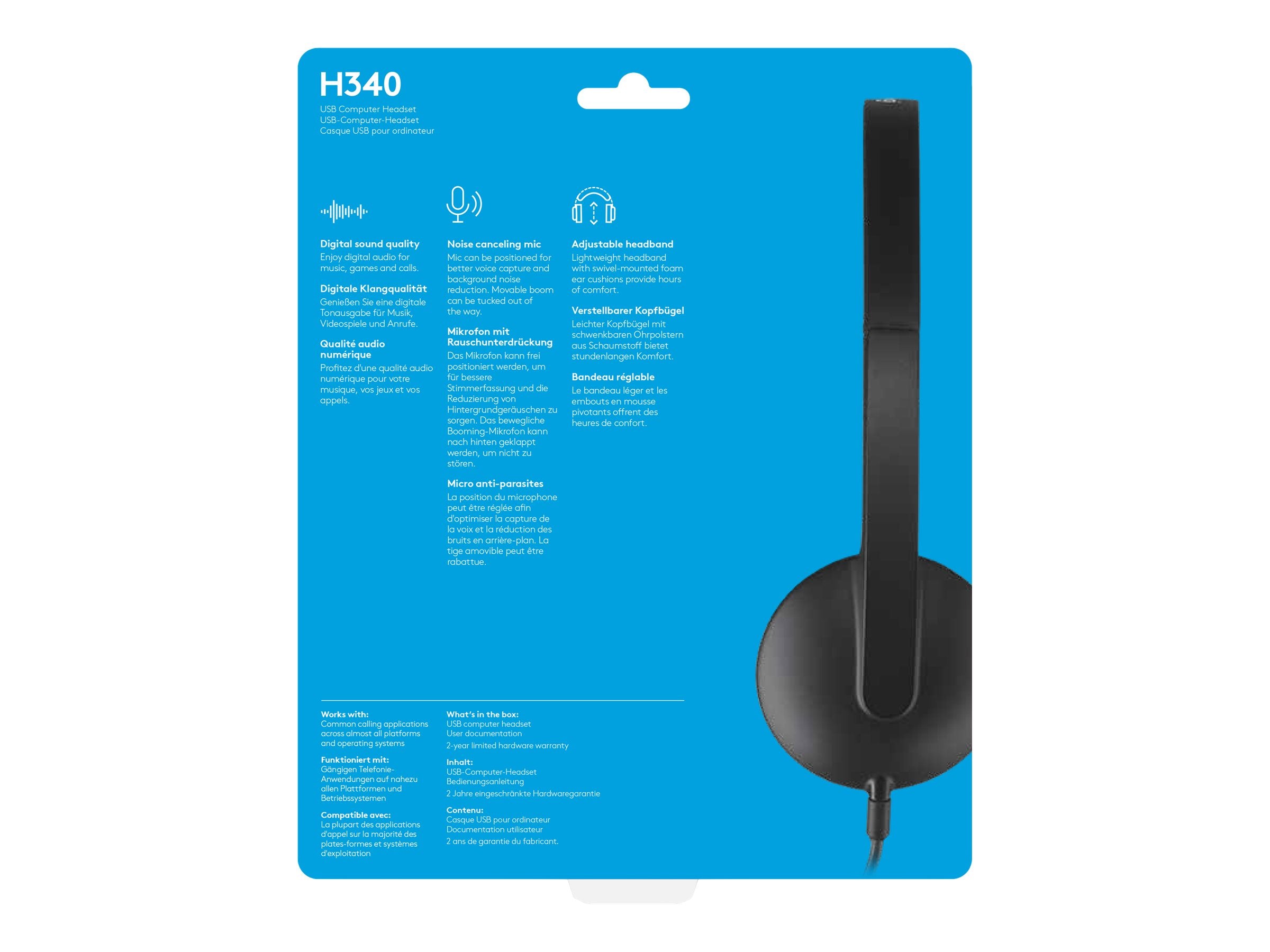 Casque USB Logitech H340 - Micro-casque - sur-oreille - filaireLe casque USB H340 est idéal au quotidien, avec une simple connexion USB-A prête à l'emploi. Le microphone anti-parasite réduit le bruit de fond et offre un son numérique clair et précis pour vos appels VOIP et Skype.
