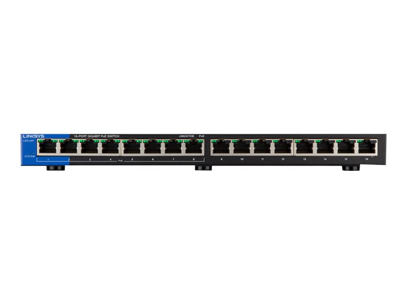 Linksys Business LGS116P - Commutateur - non géré - 8 x 10/100/1000 (PoE+) + 8 x 10/100/1000 - de bureau, fixation murale - PoE+ (80 W) - AC 100/230 VTransformez les chemins de données de votre réseau local filaire en autoroutes de l'information grâce au commutateur Gigabit PoE+ à 16 ports LGS116P Linksys pour professionnels. Doté de 16 ports Gigabit Ethernet à détection automatique permettant une vitesse de connexion filaire pouvant atteindre 1 000 Mbit/s, ce commutateur non administrable vous permet d'étendre le réseau local de votre petite ou moyenne entreprise et d'envoyer des fichiers volumineux à vos serveurs, disques durs externes et imprimantes, et ce, à une vitesse très élevée. La technologie Power over Ethernet permet d'alimenter les appareils en électricité (téléphones IP, systèmes de caméra de surveillance...) via les câbles Ethernet, et ce, sans besoin d'installer un système électrique séparé.