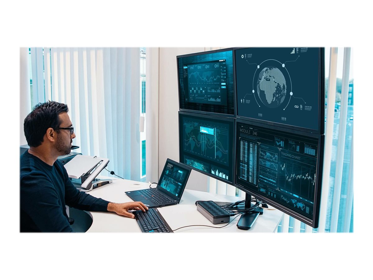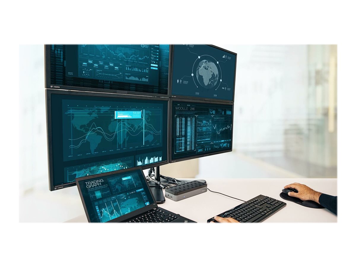 Targus Universal - Station d'accueil - USB-C / Thunderbolt 3 - 4 x DP, 4 x HDMI - 1GbE - EuropeAugmentez votre productivité et vos performances grâce à la première station d'accueil universelle de qualité professionnelle au monde permettant de se connecter sur 4 écrans en 4K. Idéale pour les grandes entreprises, la station d'accueil Targus USB-C universelle 4 sorties vidéos 4K (QV4K) optimise l'affichage du poste de travail. La technologie DualDisplayLink DL-6910 prend en charge jusqu'à quatre écrans en DisplayPort (3 840 x 2 160 p60) ou HDMI (3 840 x 2 160 p50). La station d'accueil comprend de nombreux ports supplémentaires pour vous permettre de connecter vos périphériques USB 3.0 essentiels et votre réseau Ethernet.