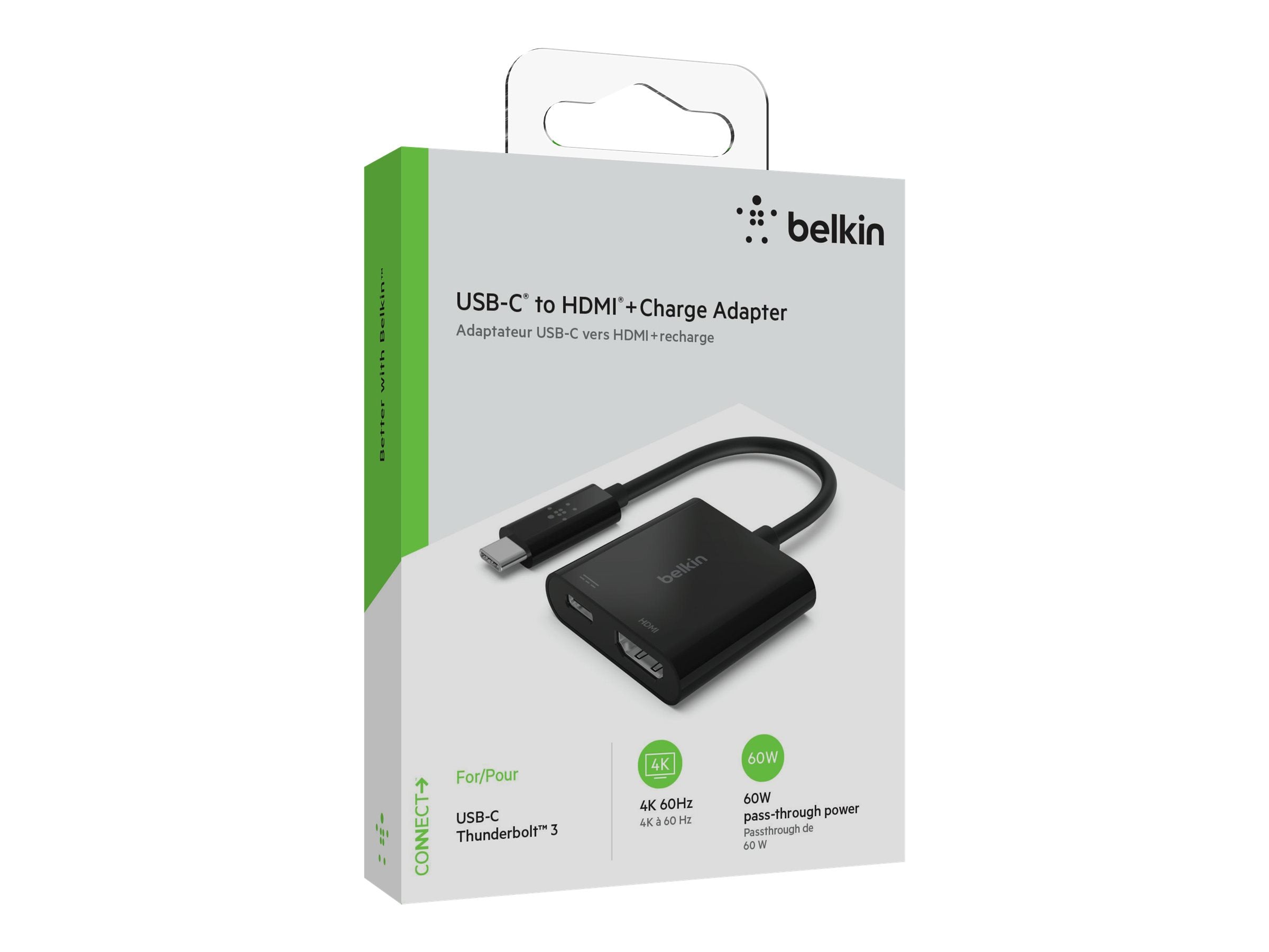 Belkin USB-C to HDMI + Charge Adapter - Adaptateur vidéo - 24 pin USB-C mâle pour HDMI, USB-C (alimentation uniquement) femelle - noir - support 4K, USB Power Delivery (60W)