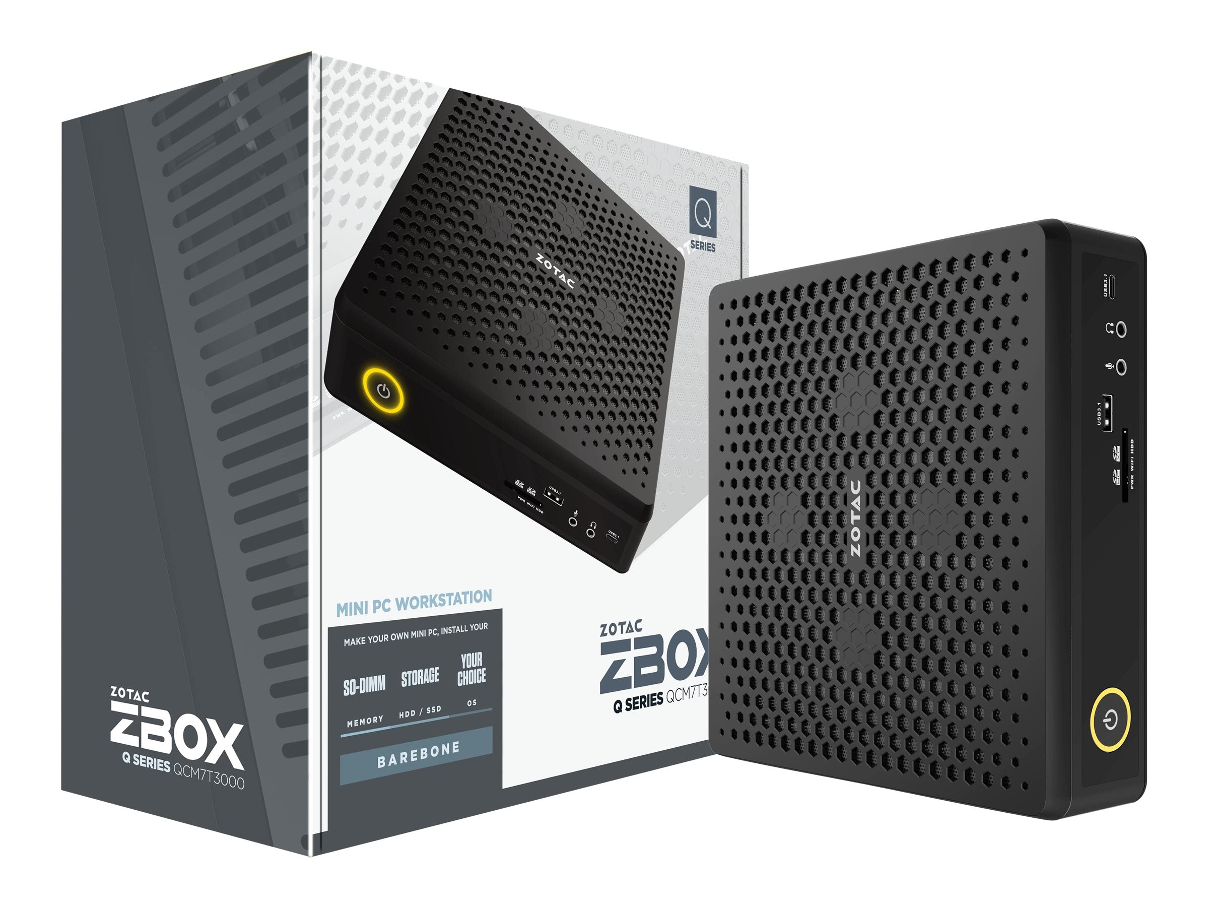 ZOTAC ZBOX Q Series QCM7T3000 - Barebone - mini PC - 1 x Core i7 10750H / jusqu'à 5 GHz - RAM 0 Go - Quadro RTX 3000 - Gigabit Ethernet, 2.5 Gigabit Ethernet - Bluetooth 5.0, 802.11a/b/g/n/ac/axLa gamme de ZBOX série Q propose les Mini PC équipés de cartes graphiques puissantes. A l'origine des premiers Mini PC, ZOTAC continue à innover en intégrant des technologies de plus en plus poussées et puissantes dans des formats particulièrement compacts, alors même qu'on les trouve habituellement dans des systèmes plus volumineux.
