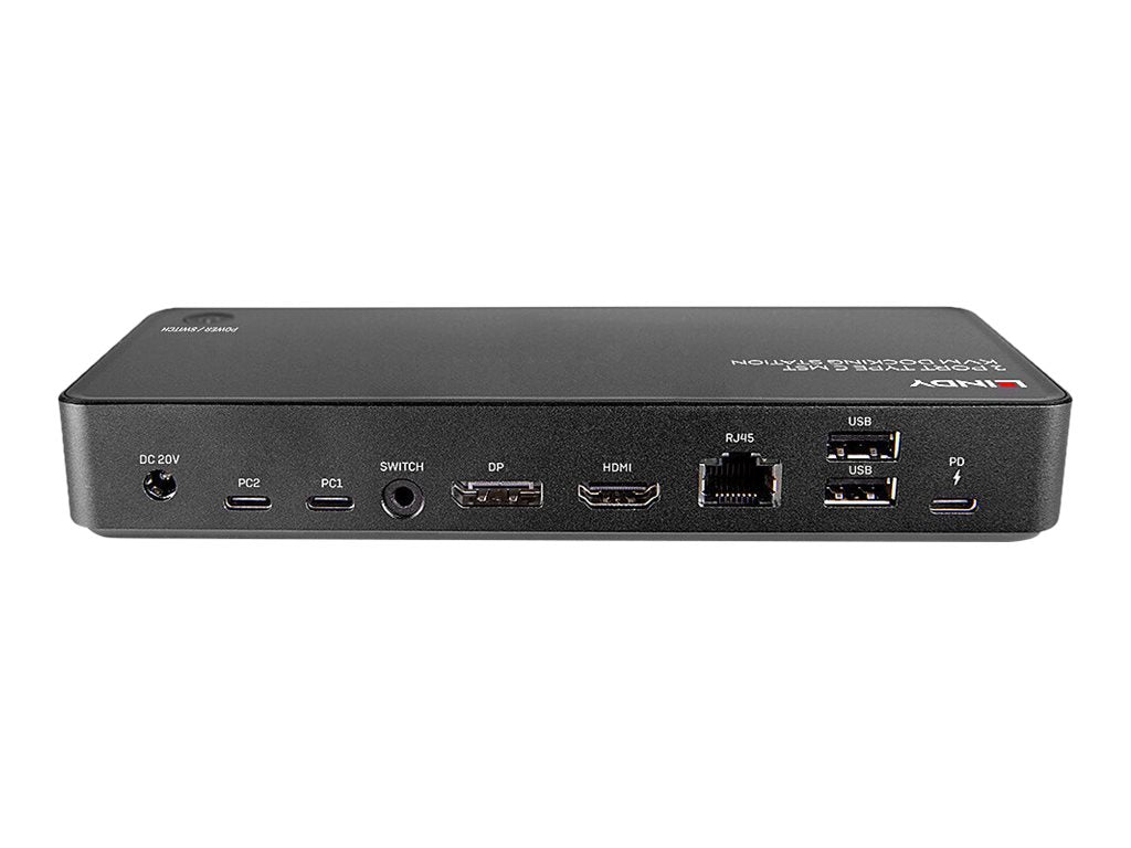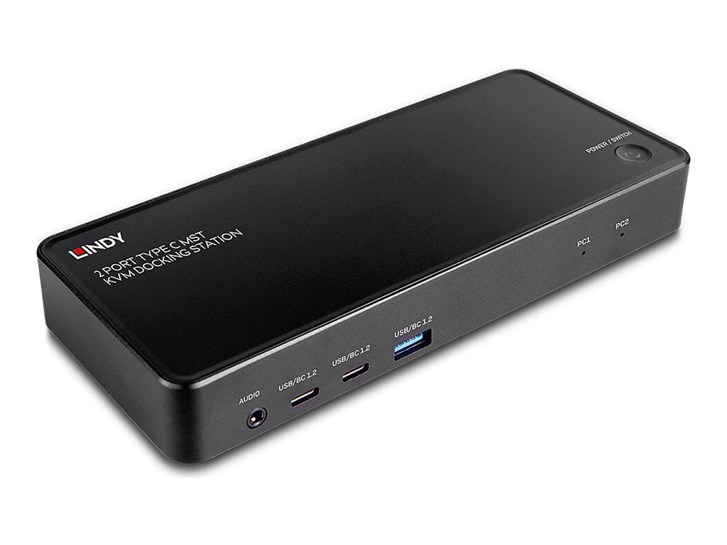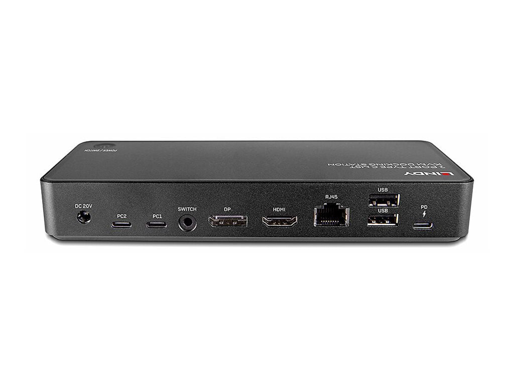 LINDY - Station d'accueil - USB-C 3.2 - DP, HDMI - 1GbELa station d'accueil Lindy 2 Port Type C MST KVM est une solution compacte et polyvalente pour connecter des ordinateurs portables à une gamme d'interfaces, y compris deux écrans. Doté de toutes les interfaces essentielles requises pour un poste de travail moderne, cet appareil combine le confort d'une station d'accueil de bureau avec un commutateur KVM de type C. Il fournit deux entrées USB 3.2 de type C pour connecter des sources telles que des ordinateurs portables, des tablettes ou des smartphones afin de partager le même poste de travail et les périphériques qui y sont connectés. La commutation est facilement possible en appuyant sur le bouton situé sur le dessus de l'unité.