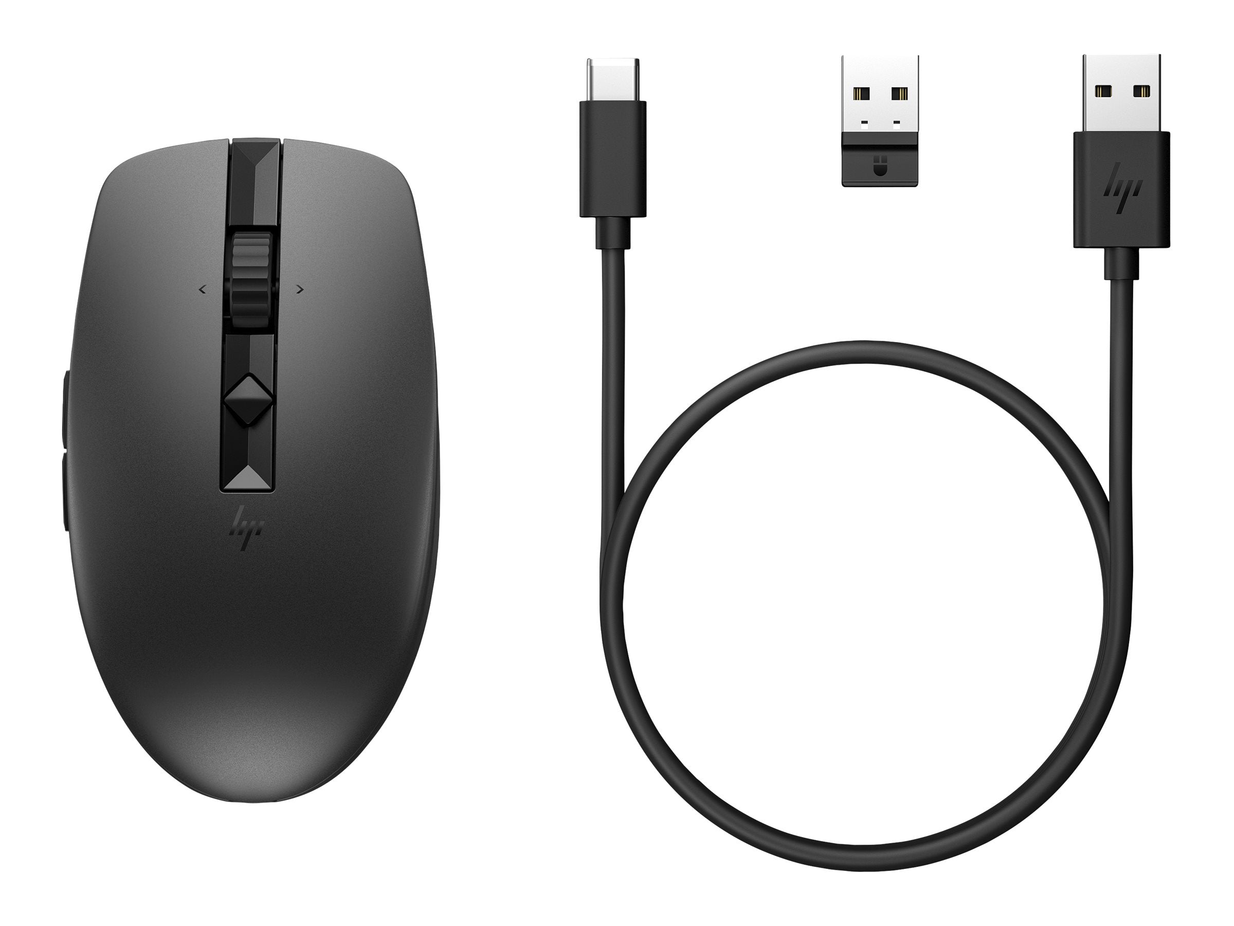 HP 715 - Souris - multi-appareils, rechargeable - 7 boutons - sans fil, filaire - Bluetooth 3.0, 2.4 GHz - récepteur sans fil USB - noirTravaillez en toute liberté grâce aux boutons programmables, à une autonomie de 90 jours et à un design ambidextre compact. Assurez votre productivité où que vous soyez, sur n'importe quelle surface et avec de nombreux appareils grâce à son capteur utilisable sur le verre et à la connectivité avec de multiples systèmes d'exploitation. Travaillez mieux avec la liberté que vous souhaitez et la flexibilité dont vous avez besoin, le tout avec une seule souris.