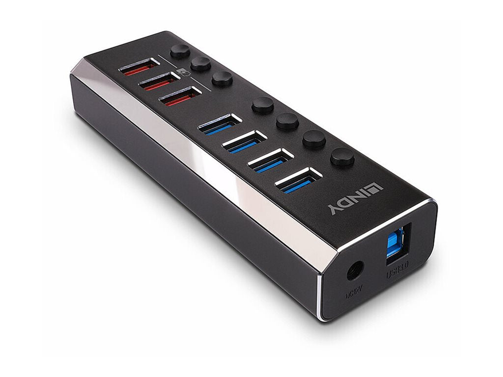 Lindy - Concentrateur (hub) - avec 3 ports de charge rapide 3.0 - 7 x USB 3.2 - de bureauLe hub USB Lindy est un complément polyvalent à tout espace de travail, conçu pour répondre aux besoins des environnements à forte demande. Ce hub dispose de 7 ports USB 3.2, dont 3 avec une capacité de charge rapide 3.0, garantissant que tous vos appareils sont connectés et alimentés efficacement. Avec une bande passante de 5 Gbps, il offre des taux de transfert de données rapides, ce qui le rend adapté à une utilisation professionnelle et personnelle. Le boîtier durable en alliage d'aluminium/ABS du concentrateur le protège de l'usure, tandis que sa conformité aux normes CP65, FCC, REACH et RoHS témoigne de l'engagement de Lindy en matière de sécurité et de responsabilité environnementale. Que vous soyez à la maison ou au bureau, ce hub vous offre la connectivité et les performances dont vous avez besoin pour rester productif.