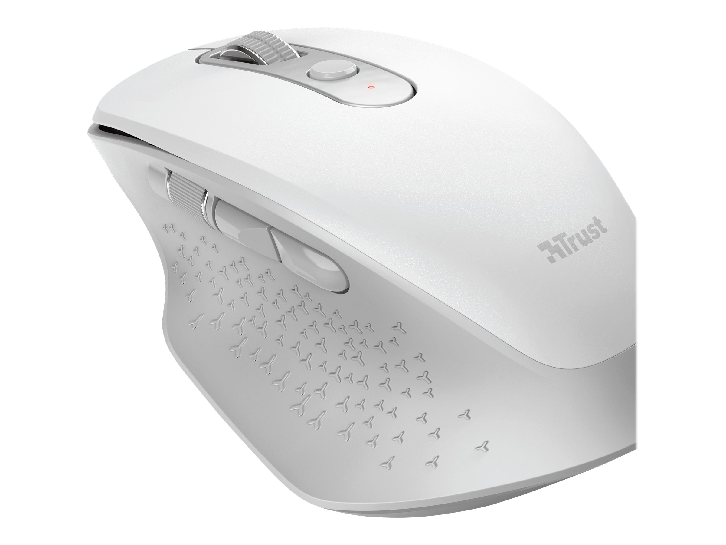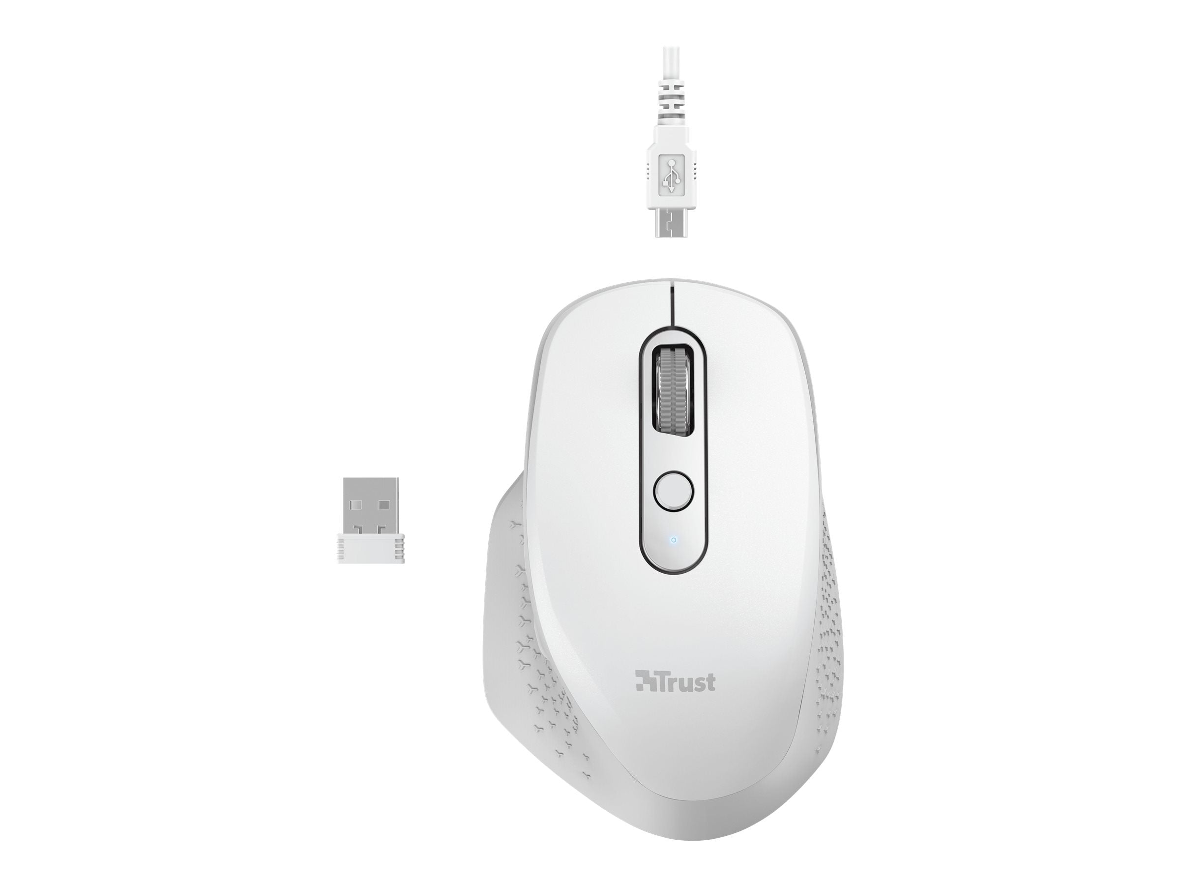 Trust Ozaa - Souris - compact, multi-appareil - pour droitiers - optique - 6 boutons - sans fil - 2.4 GHz, Bluetooth - récepteur sans fil USB - blancLa souris sans fil Trust Ozaa est conçue pour la polyvalence et le confort, ce qui la rend adaptée à divers scénarios d'utilisation. Avec une résolution de mouvement de 3200 DPI et une commutation de sensibilité en temps réel, elle permet un contrôle de précision pour le travail ou le jeu. Cette souris est dotée de six boutons, dont deux pour le pouce, et d'une molette de défilement pratique. Sa batterie intégrée et son mode d'économie d'énergie garantissent des performances durables, tandis que l'indicateur LED fournit une mise à jour claire de l'état de la souris. La conception ergonomique s'adapte aux styles de prise en main (paume ou griffe), offrant un confort adapté aux préférences de l'utilisateur. Cet appareil compact permet de coupler jusqu'à trois appareils, ce qui facilite le travail multitâche. Les options de connectivité sans fil comprennent le Bluetooth et un récepteur micro USB, ce qui offre une grande souplesse pour tous les types de configuration. En outre, le compartiment de stockage du récepteur ajoute à sa portabilité, tandis que les patins de glissement améliorent la fluidité des mouvements sur les surfaces.