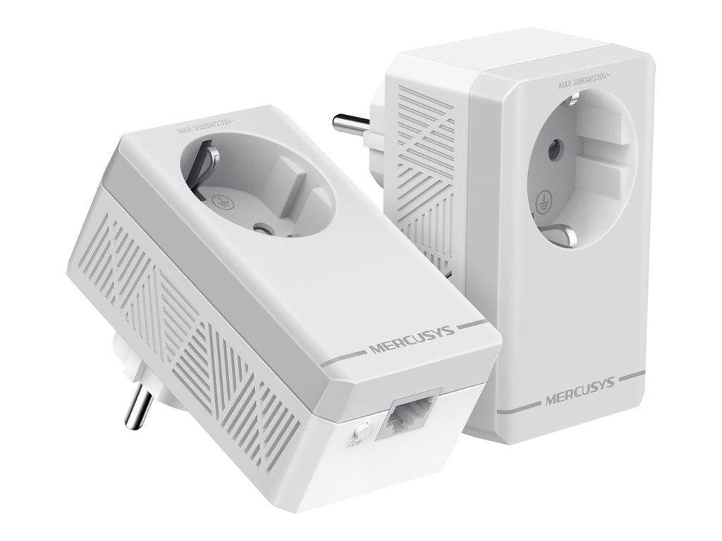 Mercusys MP300P KIT V1 - Kit d'adaptation pour courant porteur - Branchement mural (pack de 2)Le Mercusys MP300P KIT V1 est un kit d'adaptateurs CPL conçu pour améliorer le réseau domestique. Avec un débit de transfert de données de 600 Mbps et une technologie de connectivité qui utilise l'Ethernet filaire, ce kit d'adaptateurs offre un accès Internet fiable sans avoir à installer de câblage supplémentaire. L'appareil fonctionne efficacement dans divers environnements intérieurs, avec une portée pouvant atteindre 300 m, ce qui le rend adapté aux grandes maisons. Ce kit se caractérise par une configuration Plug-and-Play simple, permettant aux utilisateurs d'établir rapidement des connexions avec un minimum d'effort. Pour plus de sécurité, il utilise un algorithme de cryptage AES 128 bits robuste. Son format mural permet de gagner de la place et comprend un mode d'économie d'énergie pour réduire la consommation d'énergie pendant le fonctionnement. Idéal pour le streaming, les jeux et les vidéoconférences, le MP300P KIT V1 est une solution pratique pour tous ceux qui souhaitent améliorer les capacités de leur réseau domestique.